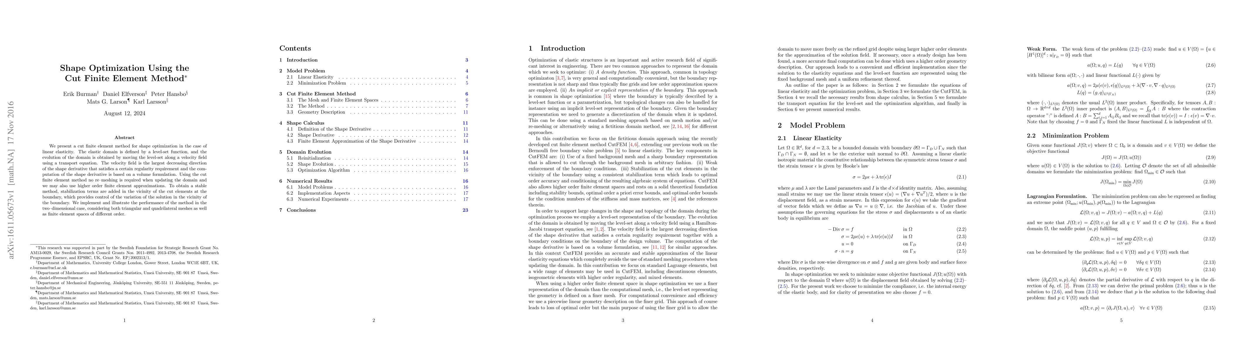 The paper introduces a cut finite element method for shape optimization in linear elasticity, incorporating a level-set function and a transport equation for domain evolution, along with stabilization terms for stability control.