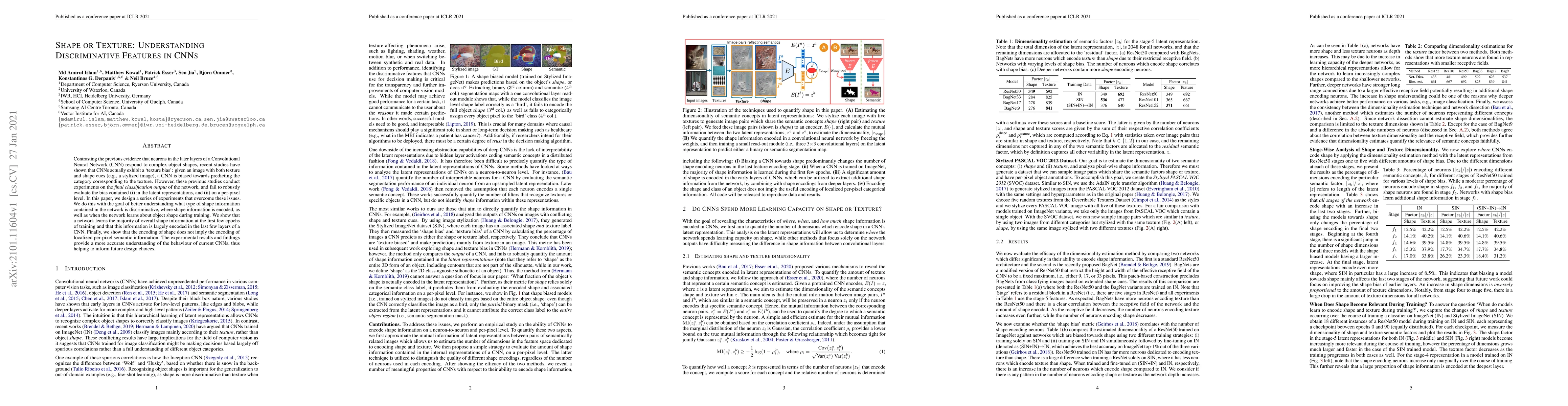 This paper investigates the discriminative features in Convolutional Neural Networks (CNNs), revealing that while CNNs are often thought to respond to complex object shapes, they actually exhibit a "texture bias." The study aims to understand the shape information encoded in the network, its location, and the timing of its learning during training, providing insights into the network's behavior and informing future design choices.