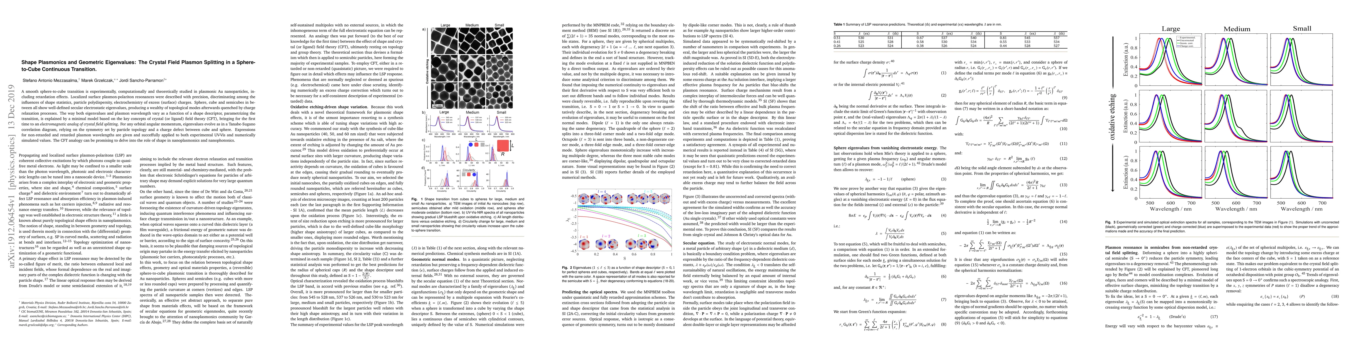 A smooth sphere-to-cube transition is experimentally, computationally and theoretically studied in plasmonic Au nanoparticles, including retardation effects. Localized surface plasmon-polariton resonances were described with precision, discriminating among the influences of shape statistics, particle polydispersity, electrochemistry of excess (surface) charges. Sphere, cube and semicubes in between all show well-defined secular electrostatic eigenvalues, producing a wealthy of topological modes afterwards quenched by charge relaxation processes. The way both eigenvalues and plasmon wavelength vary as a function of a shape descriptor, parametrizing the transition, is explained by a minimal model based on the key concepts of crystal (or ligand) field theory (CFT), bringing for the first time to an {\em electromagnetic analog of crystal field splitting}. For any orbital angular momentum, eigenvalues evolve as in a Tanabe-Sugano correlation diagram, relying on the symmetry set by particle topology and a charge defect between cube and sphere. Expressions for non-retarded and retarded plasmon wavelengths are given and succeffully applied to both experimental UV-Vis and numerically simulated values. The CFT analogy can be promising to delve into the role of shape in nanoplasmonics and nanophotonics.