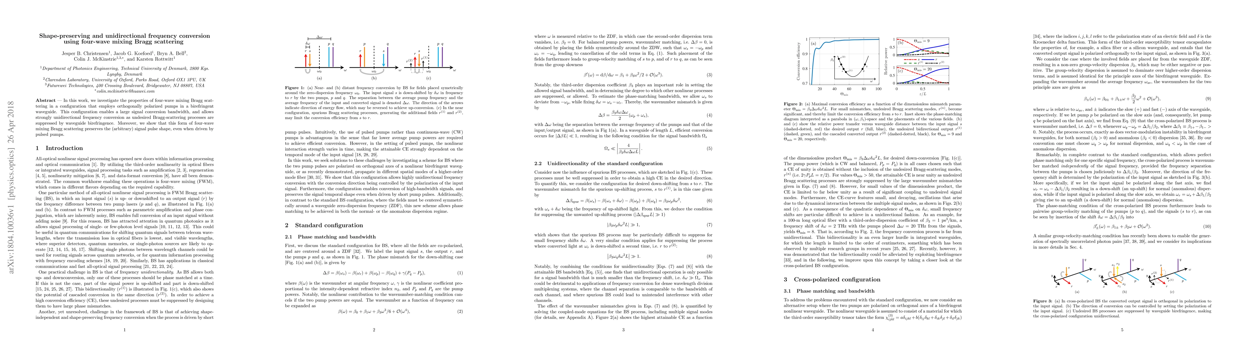 This study explores four-wave mixing Bragg scattering in birefringent waveguides with orthogonally polarized pumps, achieving large bandwidth and unidirectional frequency conversion while suppressing undesired scattering. The method preserves the original signal pulse shape during conversion.