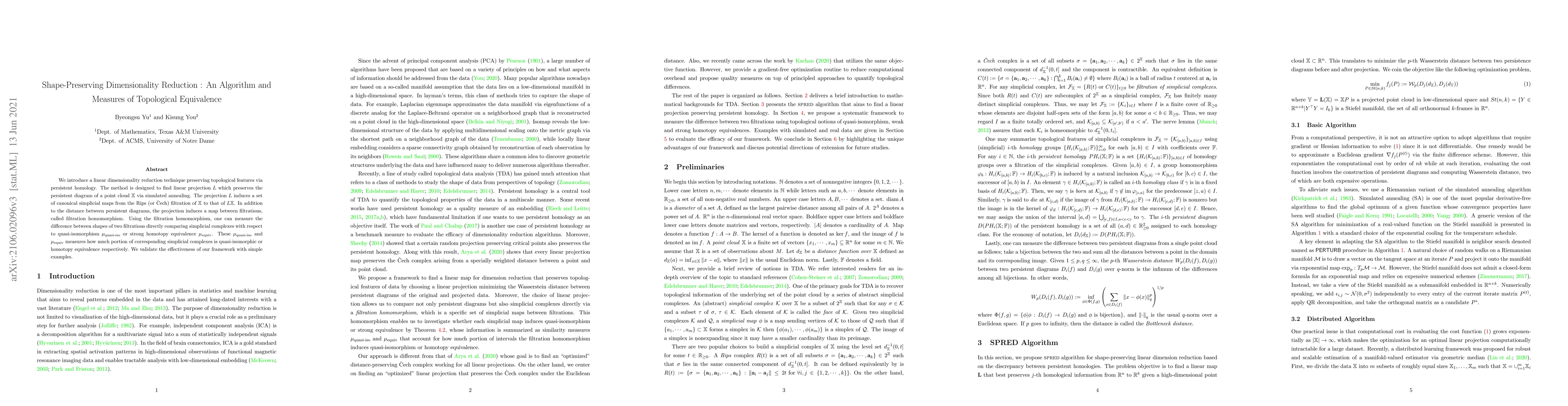 We introduce a linear dimensionality reduction technique preserving topological features via persistent homology. The method is designed to find linear projection $L$ which preserves the persistent diagram of a point cloud $\mathbb{X}$ via simulated annealing. The projection $L$ induces a set of canonical simplicial maps from the Rips (or \v{C}ech) filtration of $\mathbb{X}$ to that of $L\mathbb{X}$. In addition to the distance between persistent diagrams, the projection induces a map between filtrations, called filtration homomorphism. Using the filtration homomorphism, one can measure the difference between shapes of two filtrations directly comparing simplicial complexes with respect to quasi-isomorphism $\mu_{\operatorname{quasi-iso}}$ or strong homotopy equivalence $\mu_{\operatorname{equiv}}$. These $\mu_{\operatorname{quasi-iso}}$ and $\mu_{\operatorname{equiv}}$ measures how much portion of corresponding simplicial complexes is quasi-isomorphic or homotopy equivalence respectively. We validate the effectiveness of our framework with simple examples.