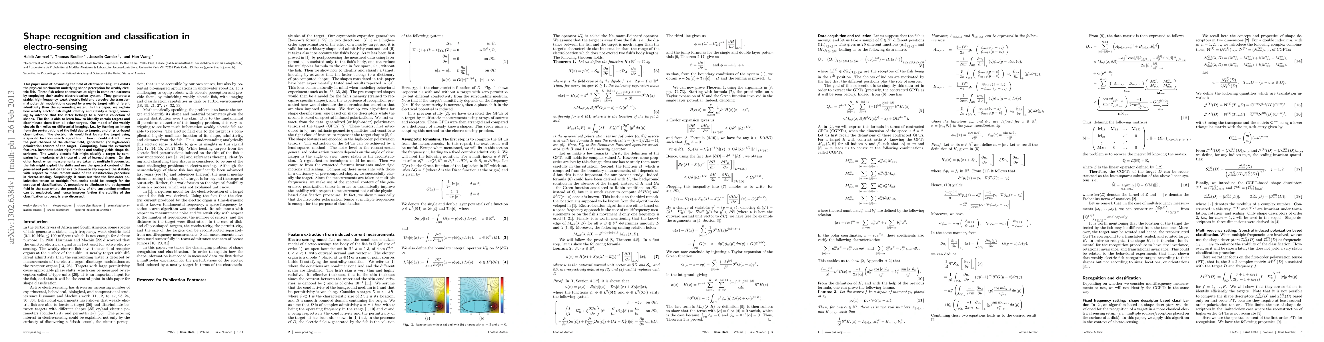 This paper aims at advancing the field of electro-sensing. It exhibits the physical mechanism underlying shape perception for weakly electric fish. These fish orient themselves at night in complete darkness by employing their active electrolocation system. They generate a stable, high-frequency, weak electric field and perceive the transdermal potential modulations caused by a nearby target with different admittivity than the surrounding water. In this paper, we explain how weakly electric fish might identify and classify a target, knowing by advance that the latter belongs to a certain collection of shapes. Our model of the weakly electric fish relies on differential imaging, i.e., by forming an image from the perturbations of the field due to targets, and physics-based classification. The electric fish would first locate the target using a specific location search algorithm. Then it could extract, from the perturbations of the electric field, generalized (or high-order) polarization tensors of the target. Computing, from the extracted features, invariants under rigid motions and scaling yields shape descriptors. The weakly electric fish might classify a target by comparing its invariants with those of a set of learned shapes. On the other hand, when measurements are taken at multiple frequencies, the fish might exploit the shifts and use the spectral content of the generalized polarization tensors to dramatically improve the stability with respect to measurement noise of the classification procedure in electro-sensing. Surprisingly, it turns out that the first-order polarization tensor at multiple frequencies could be enough for the purpose of classification. A procedure to eliminate the background field in the case where the permittivity of the surrounding medium can be neglected, and hence improve further the stability of the classification process, is also discussed.