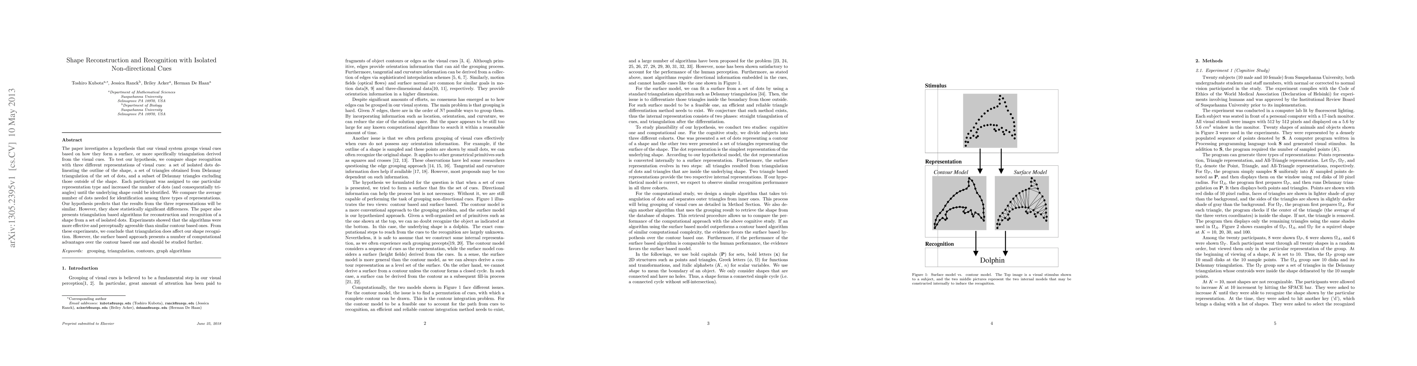The paper investigates a hypothesis that our visual system groups visual cues based on how they form a surface, or more specifically triangulation derived from the visual cues. To test our hypothesis, we compare shape recognition with three different representations of visual cues: a set of isolated dots delineating the outline of the shape, a set of triangles obtained from Delaunay triangulation of the set of dots, and a subset of Delaunay triangles excluding those outside of the shape. Each participant was assigned to one particular representation type and increased the number of dots (and consequentially triangles) until the underlying shape could be identified. We compare the average number of dots needed for identification among three types of representations. Our hypothesis predicts that the results from the three representations will be similar. However, they show statistically significant differences. The paper also presents triangulation based algorithms for reconstruction and recognition of a shape from a set of isolated dots. Experiments showed that the algorithms were more effective and perceptually agreeable than similar contour based ones. From these experiments, we conclude that triangulation does affect our shape recognition. However, the surface based approach presents a number of computational advantages over the contour based one and should be studied further.