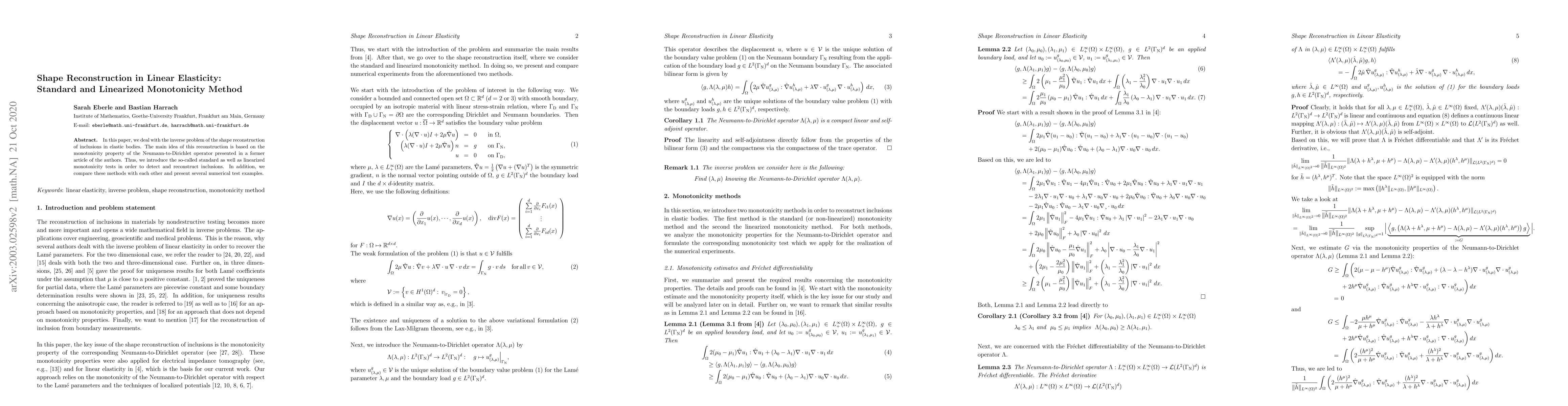 This paper introduces a shape reconstruction method for inclusions in elastic bodies using monotonicity tests, comparing standard and linearized methods with numerical test examples.