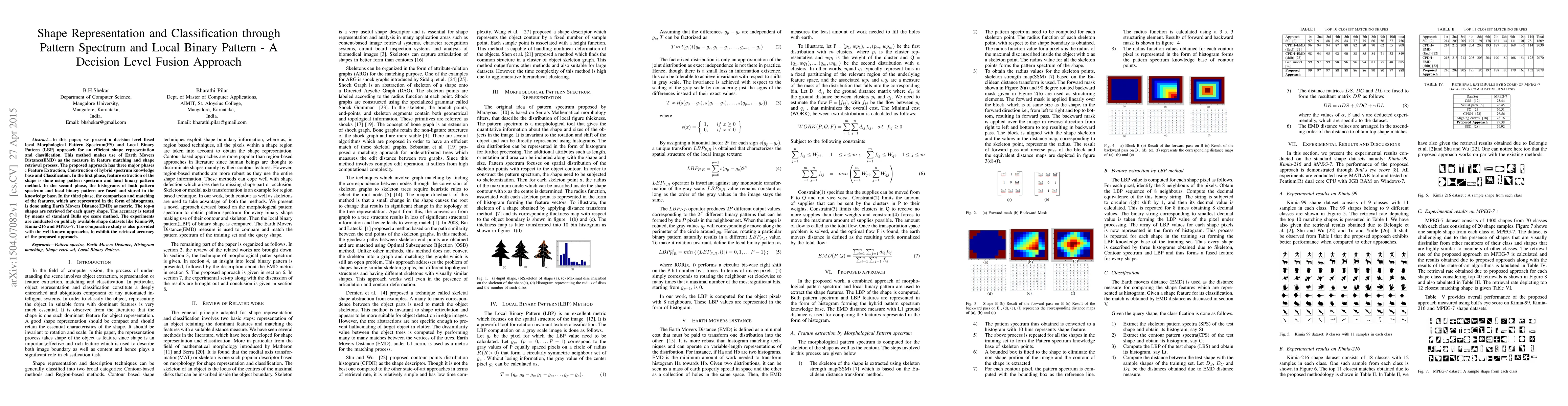 This paper proposes a decision level fusion of Morphological Pattern Spectrum and Local Binary Pattern for shape representation and classification, utilizing Earth Movers Distance for feature matching. The method involves feature extraction, hybrid knowledge base construction, and classification, achieving high retrieval accuracy on standard datasets.
