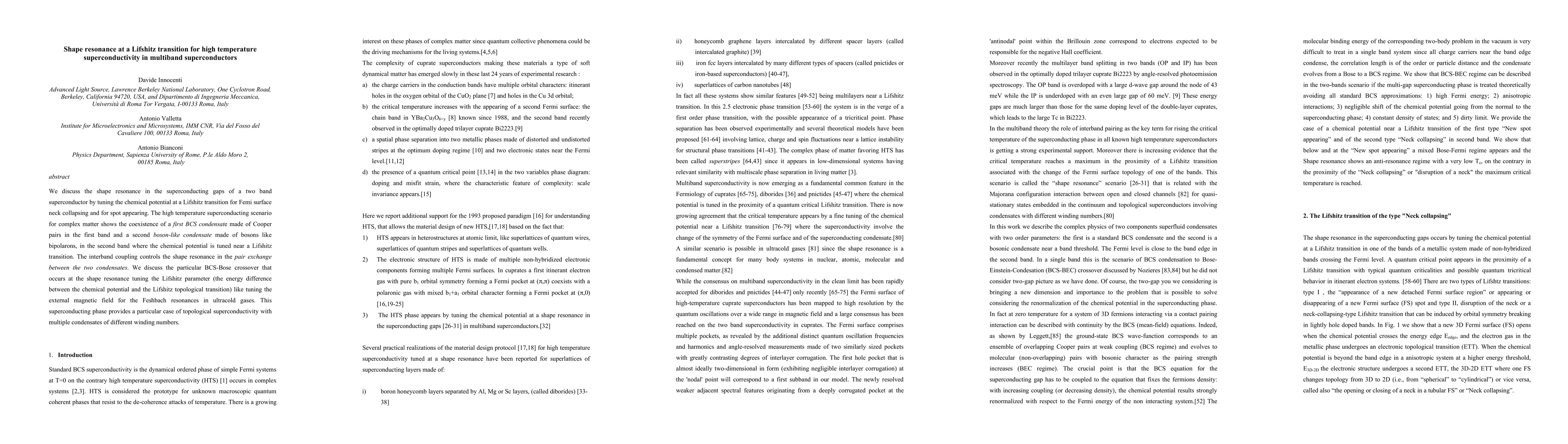 We discuss the shape resonance in the superconducting gaps of a two band superconductor by tuning the chemical potential at a Lifshitz transition for Femi surface neck collapsing and for spot appearing. The high temperature superconducting scenario for complex matter shows the coexistence of a first BCS condensate made of Cooper pairs in the first band and a second boson-like condensate made of bosons like bipolarons, in the second band where the chemical potential is tuned near a Lifshitz transition. The interband coupling controls the shape resonance in the pair exchange between the two condensates. We discuss the particular BCS-Bose crossover that occurs at the shape resonance tuning the Lifshitz parameter (the energy difference between the chemical potential and the Lifshitz topological transition) like tuning the external magnetic field for the Feshbach resonances in ultracold gases. This superconducting phase provides a particular case of topological superconductivity with multiple condensates of different winding numbers