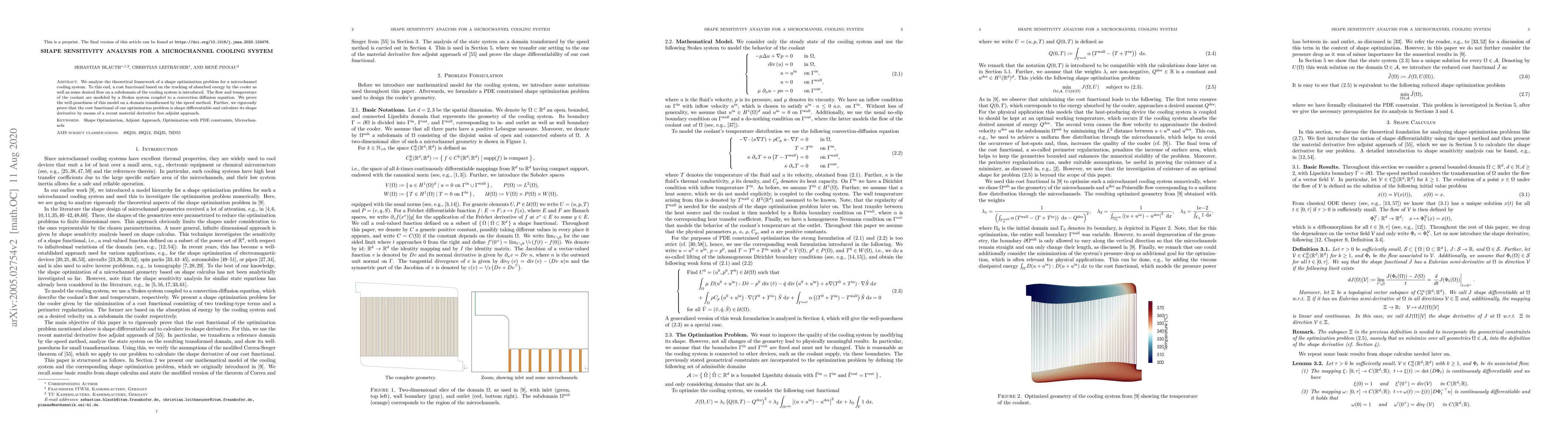 Researchers analyzed a shape optimization problem for microchannel cooling systems using a cost functional based on absorbed energy and desired flow. They proved the well-posedness of the model and calculated its shape derivative using an adjoint approach.
