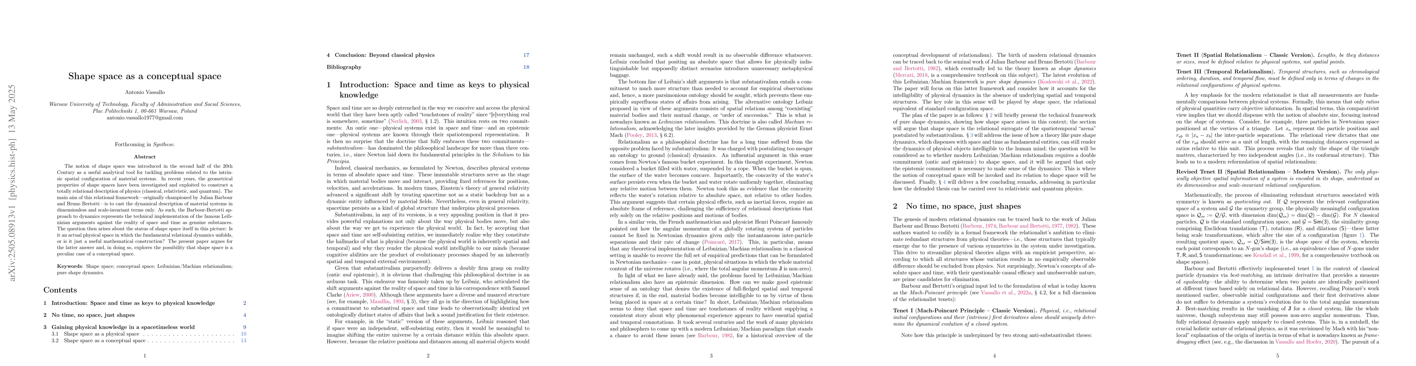This research contributes to the ongoing debate in the philosophy of physics, particularly regarding the ontological status of shape space in relational theories, and may influence how researchers conceptualize and apply shape spaces in theoretical physics.