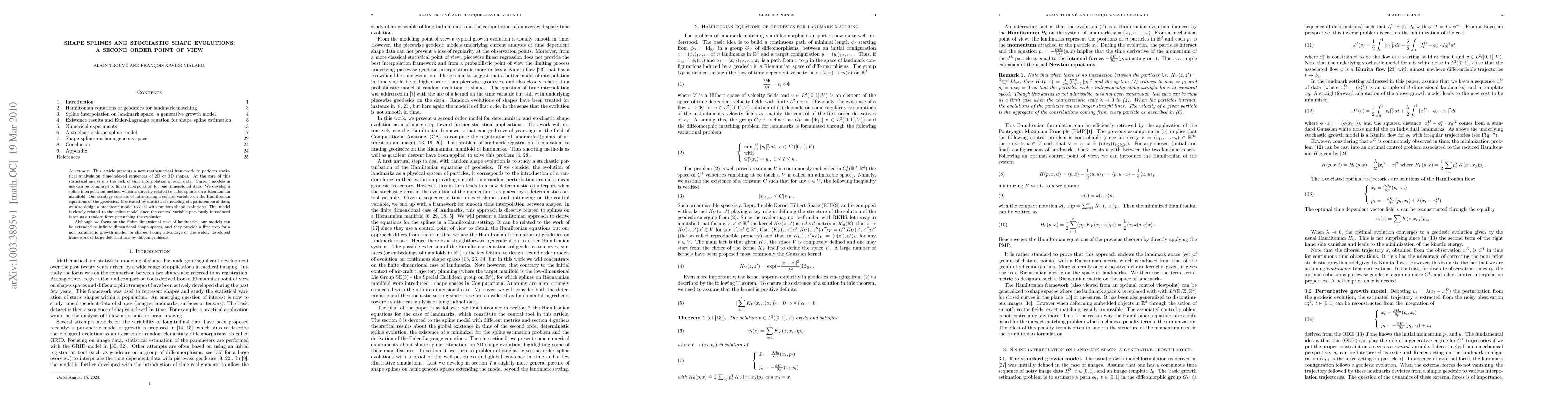 This article presents a new mathematical framework to perform statistical analysis on time-indexed sequences of 2D or 3D shapes. At the core of this statistical analysis is the task of time interpolation of such data. Current models in use can be compared to linear interpolation for one dimensional data. We develop a spline interpolation method which is directly related to cubic splines on a Riemannian manifold. Our strategy consists of introducing a control variable on the Hamiltonian equations of the geodesics. Motivated by statistical modeling of spatiotemporal data, we also design a stochastic model to deal with random shape evolutions. This model is closely related to the spline model since the control variable previously introduced is set as a random force perturbing the evolution. Although we focus on the finite dimensional case of landmarks, our models can be extended to infinite dimensional shape spaces, and they provide a first step for a non parametric growth model for shapes taking advantage of the widely developed framework of large deformations by diffeomorphisms.