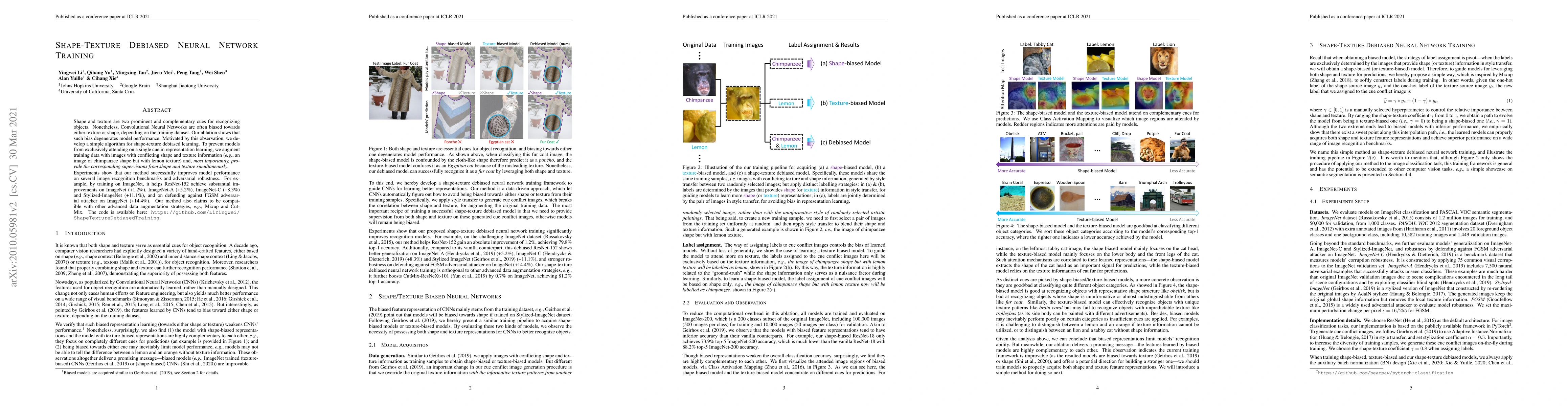 Shape and texture are two prominent and complementary cues for recognizing objects. Nonetheless, Convolutional Neural Networks are often biased towards either texture or shape, depending on the training dataset. Our ablation shows that such bias degenerates model performance. Motivated by this observation, we develop a simple algorithm for shape-texture debiased learning. To prevent models from exclusively attending on a single cue in representation learning, we augment training data with images with conflicting shape and texture information (eg, an image of chimpanzee shape but with lemon texture) and, most importantly, provide the corresponding supervisions from shape and texture simultaneously. Experiments show that our method successfully improves model performance on several image recognition benchmarks and adversarial robustness. For example, by training on ImageNet, it helps ResNet-152 achieve substantial improvements on ImageNet (+1.2%), ImageNet-A (+5.2%), ImageNet-C (+8.3%) and Stylized-ImageNet (+11.1%), and on defending against FGSM adversarial attacker on ImageNet (+14.4%). Our method also claims to be compatible with other advanced data augmentation strategies, eg, Mixup, and CutMix. The code is available here: https://github.com/LiYingwei/ShapeTextureDebiasedTraining.