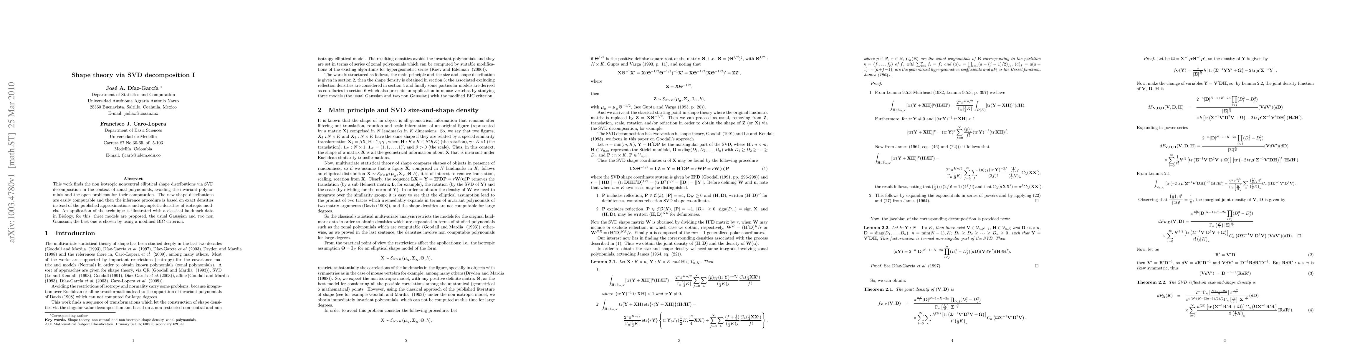 The research proposes a shape theory via SVD decomposition, avoiding the use of invariant polynomials and focusing on zonal polynomials for non isotropic noncentral elliptical shape distributions. It introduces easily computable shape distributions and an inference procedure based on exact densities.