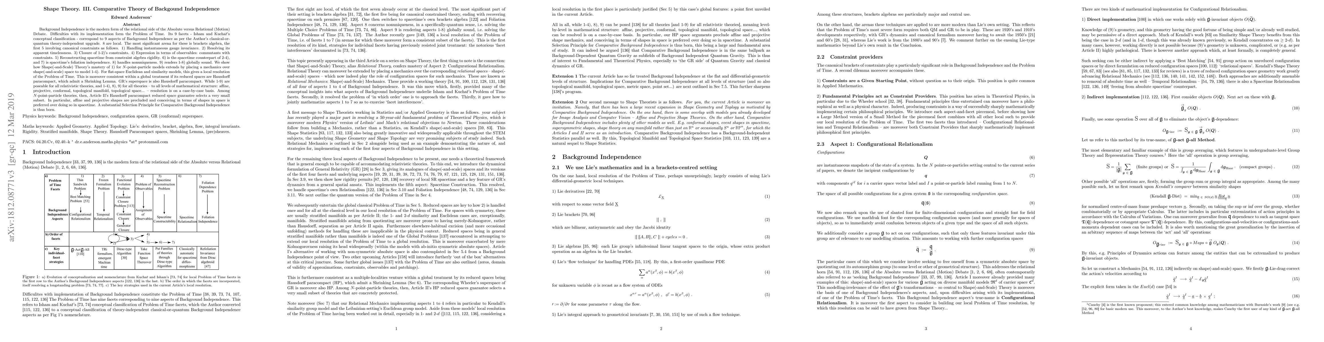 Background Independence is the modern form of the relational side of the Absolute versus Relational Debate. Difficulties with its implementation form the Problem of Time. Its 9 facets - Isham and Kucha\v{r}'s conceptual classification - correspond to 9 aspects of Background Independence as per the Author's classical-or-quantum theory-independent upgrade. 8 are local. The most significant arena for these is brackets algebra, the first 5 involving canonical constraints as follows. 1) Handling instantaneous gauge invariance. 2) Resolving its apparent timelessness. 3) Closure of 1-2)'s constraints. 4) Expression in terms of observables: commutants with constraints. 5) Reconstructing spacetime from constraint algebra rigidity. 6) is the spacetime counterpart of 2-4), and 7) is spacetime's foliation independence. 8) handles nonuniqueness. 9) renders 1-8) globally sound. We show how Shape(-and-Scale) Theory's mastery of 1) for N-point-particle models extends by placing a mechanics over shape(-and-scale) space to model 1-4). For flat-space Euclidean and similarity models, this gives a local resolution of the Problem of Time. This is moreover consistent within a global treatment if its reduced spaces are Hausdorff paracompact, which admit a Shrinking Lemma. GR's superspace is also Hausdorff paracompact. While 1-9) are poseable for all relativistic theories, and 1-4), 8), 9) for all theories - to all levels of mathematical structure: affine, projective, conformal, topological manifold, topological space... - resolution is on a case-by-case basis. Among N-point-particle theories, then, Article II's Hausdorff paracompact reduced space guarantee selects a very small subset. In particular, affine and projective shapes are precluded and conceiving in terms of shapes in space is preferred over doing so in spacetime. A substantial Selection Principle for Comparative Background Independence is thus born.