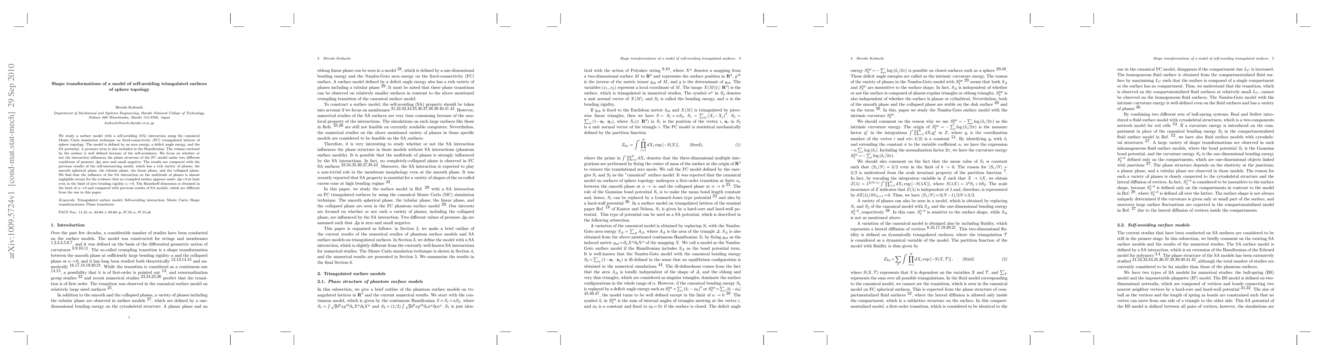 We study a surface model with a self-avoiding (SA) interaction using the canonical Monte Carlo simulation technique on fixed-connectivity (FC) triangulated lattices of sphere topology. The model is defined by an area energy, a deficit angle energy, and the SA potential. A pressure term is also included in the Hamiltonian. The volume enclosed by the surface is well defined because of the self-avoidance. We focus on whether or not the interaction influences the phase structure of the FC model under two different conditions of pressure ${\it \Delta} p$; zero and small negative. The results are compared with the previous results of the self-intersecting model, which has a rich variety of phases; the smooth spherical phase, the tubular phase, the linear phase, and the collapsed phase. We find that the influence of the SA interaction on the multitude of phases is almost negligible except for the evidence that no crumpled surface appears under ${\it \Delta} p\=\0$ at least even in the limit of zero bending rigidity $\alpha\to \0$. The Hausdorff dimension is obtained in the limit of $\alpha\to \0$ and compared with previous results of SA models, which are different from the one in this paper.