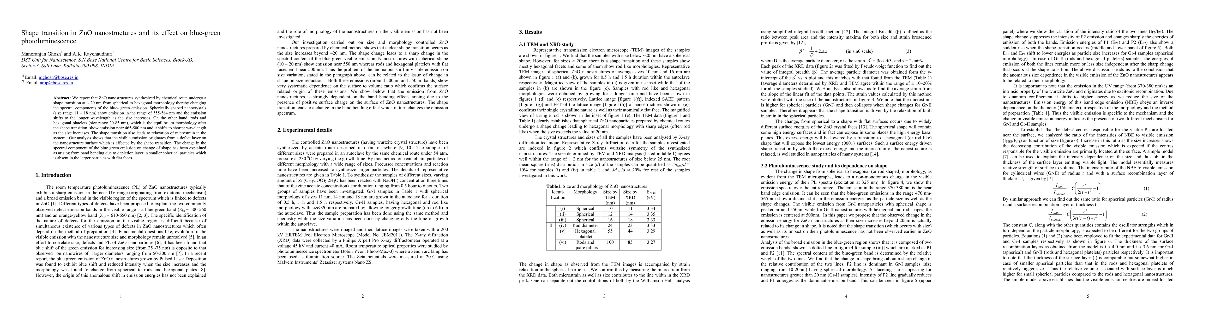 This paper investigates the shape transition in ZnO nanostructures from spherical to hexagonal, which alters their blue-green photoluminescence. The emission shifts to longer wavelengths for smaller spherical particles and to shorter wavelengths for larger hexagonal structures, attributed to band bending and microstrain relaxation.