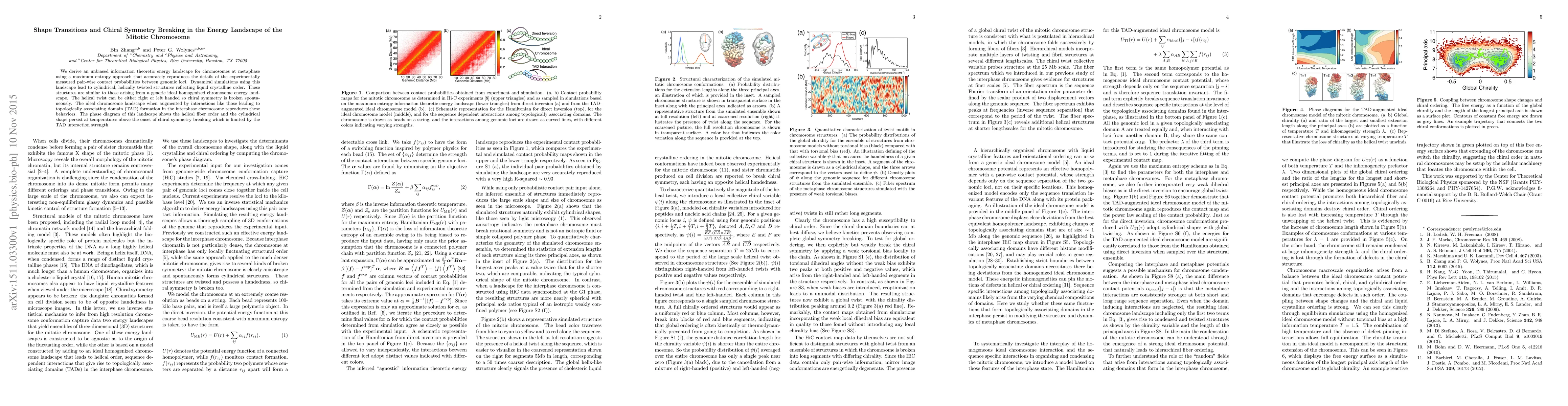 We derive an unbiased information theoretic energy landscape for chromosomes at metaphase using a maximum entropy approach that accurately reproduces the details of the experimentally measured pair-wise contact probabilities between genomic loci. Dynamical simulations using this landscape lead to cylindrical, helically twisted structures reflecting liquid crystalline order. These structures are similar to those arising from a generic ideal homogenized chromosome energy landscape. The helical twist can be either right or left handed so chiral symmetry is broken spontaneously. The ideal chromosome landscape when augmented by interactions like those leading to topologically associating domain (TAD) formation in the interphase chromosome reproduces these behaviors. The phase diagram of this landscape shows the helical fiber order and the cylindrical shape persist at temperatures above the onset of chiral symmetry breaking which is limited by the TAD interaction strength.