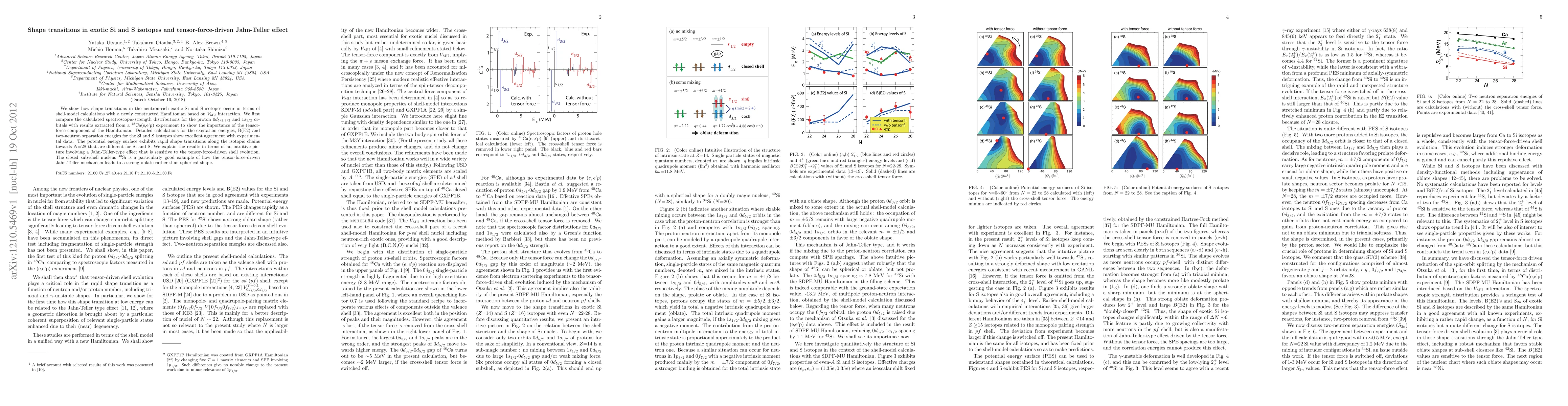 This paper investigates shape transitions in neutron-rich Si and S isotopes using a shell model with a V_MU Hamiltonian, demonstrating the tensor-force-driven Jahn-Teller effect. The model's predictions for spectroscopic strengths and excitation energies align well with experimental data, highlighting the role of tensor forces in shaping these isotopes.