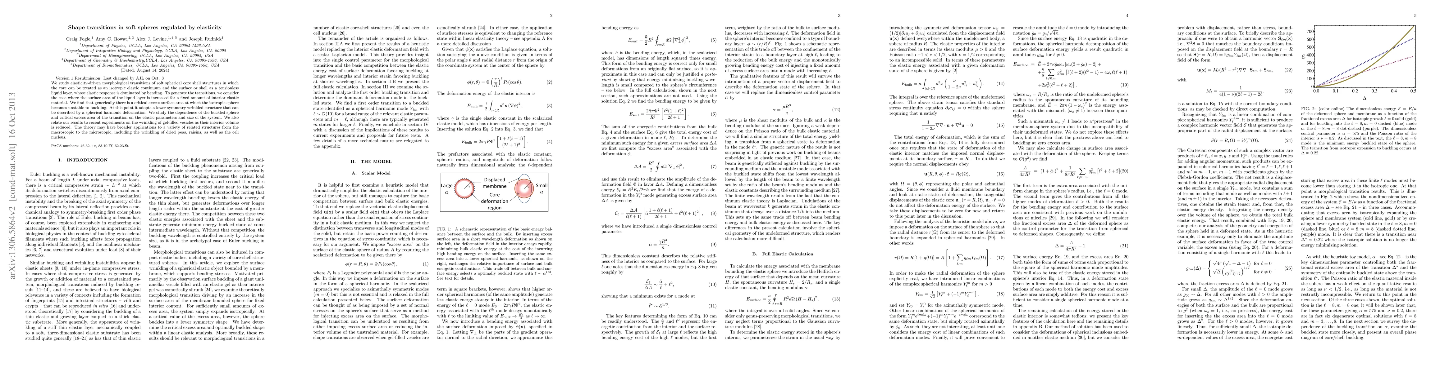We study elasticity-driven morphological transitions of soft spherical core shell structures in which the core can be treated as an isotropic elastic continuum and the surface or shell as a tensionless liquid layer, whose elastic response is dominated by bending. To generate the transitions, we consider the case where the surface area of the liquid layer is increased for a fixed amount of interior elastic material. We find that generically there is a critical excess surface area at which the isotropic sphere becomes unstable to buckling. At this point it adopts a lower symmetry wrinkled structure that can be described by a spherical harmonic deformation. We study the dependence of the buckled sphere and critical excess area of the transition on the elastic parameters and size of the system. We also relate our results to recent experiments on the wrinkling of gel-filled vesicles as their interior volume is reduced. The theory may have broader applications to a variety of related structures from the macroscopic to the microscopic, including the wrinkling of dried peas, raisins, as well as the cell nucleus.