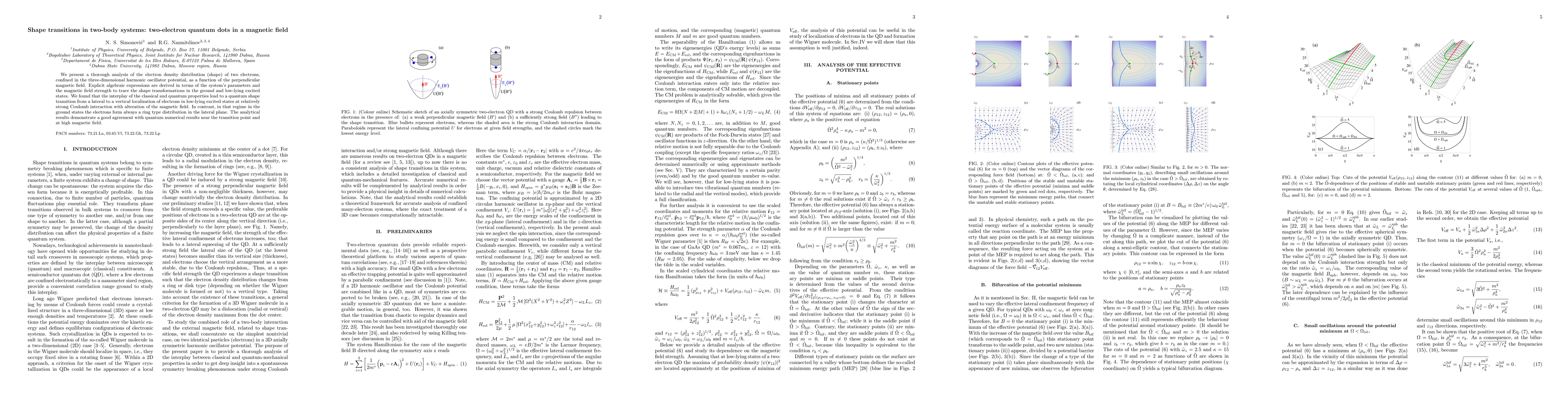 This paper analyzes the electron density distribution in two-electron quantum dots under a magnetic field, revealing a quantum shape transition from lateral to vertical localization in excited states. Ground states consistently show a ring-type distribution, with analytical results matching numerical findings.