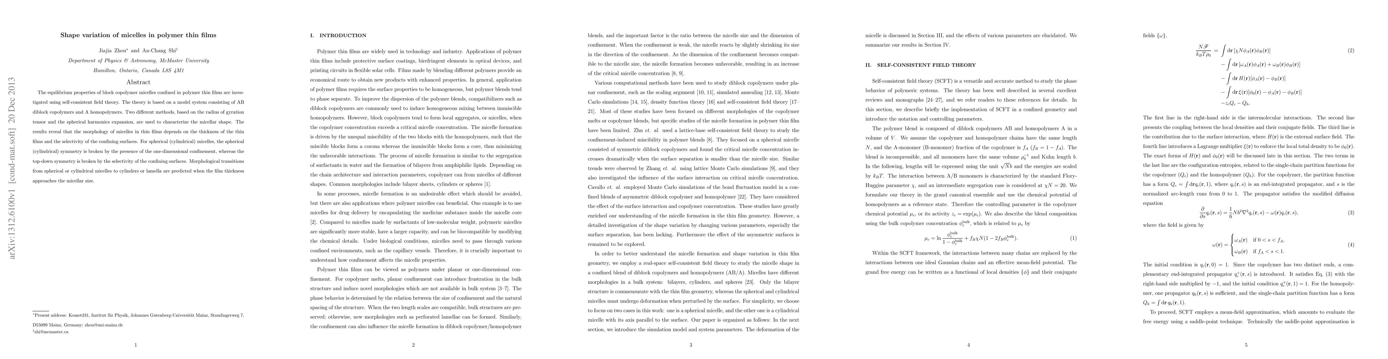 SCFT calculations were performed to study the effects of film thickness and surface interactions on micelle formation.
