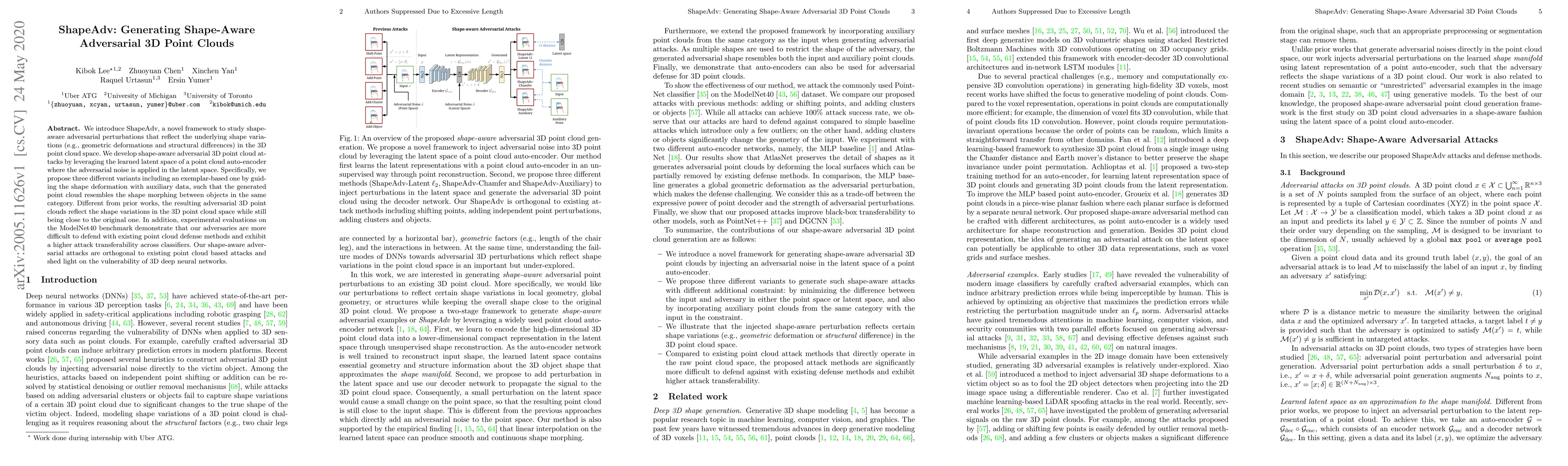 ShapeAdv introduces a framework for generating shape-aware adversarial attacks on 3D point clouds, leveraging the latent space of a point cloud auto-encoder to reflect geometric deformations. Experimental results show higher attack effectiveness and transferability compared to existing methods.