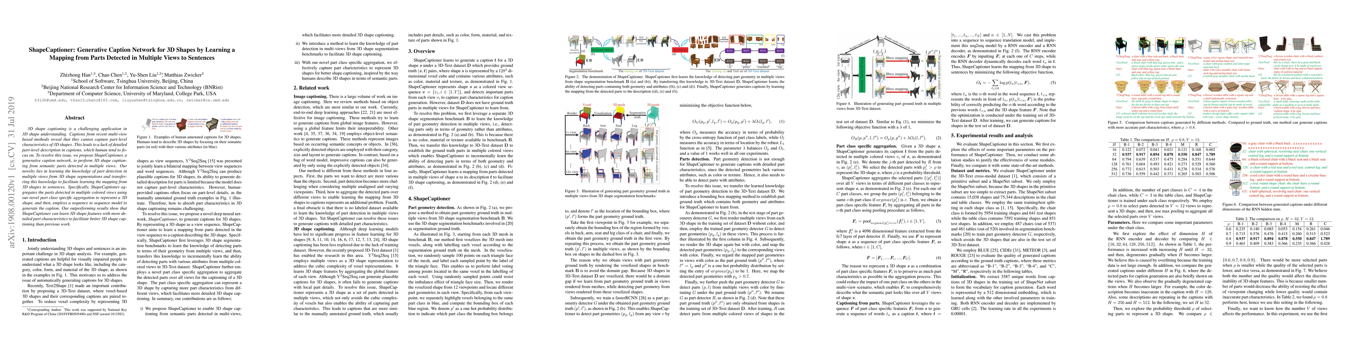 ShapeCaptioner proposes a generative caption network for 3D shapes that uses part detection in multiple views to generate detailed captions. It outperforms previous work with more accurate part-level descriptions.