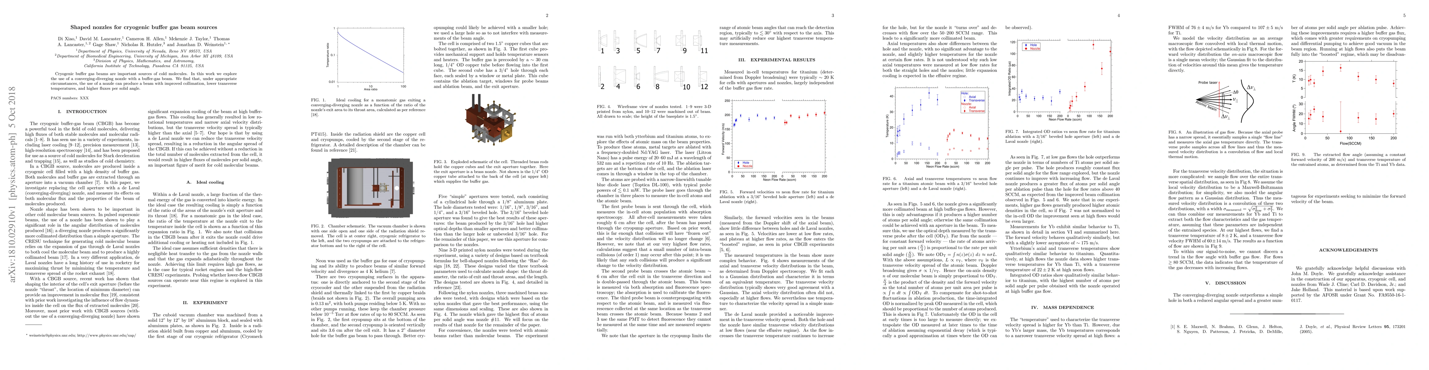 This paper investigates shaped nozzles for cryogenic buffer gas beam sources, demonstrating that a converging-diverging nozzle can enhance beam collimation, reduce transverse temperatures, and increase flux per solid angle under specific conditions.