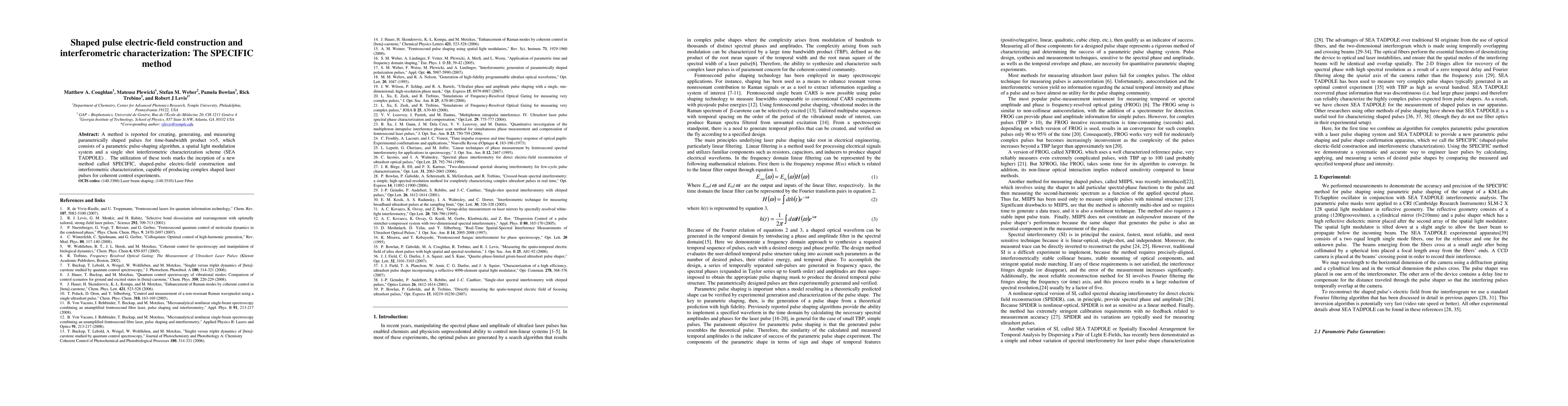 The SPECIFIC method introduces a novel technique for generating and measuring shaped laser pulses with a time-bandwidth product significantly greater than 5, utilizing a parametric pulse-shaping algorithm, spatial light modulation, and interferometric characterization. This method enables the production of complex shaped pulses for coherent control experiments.