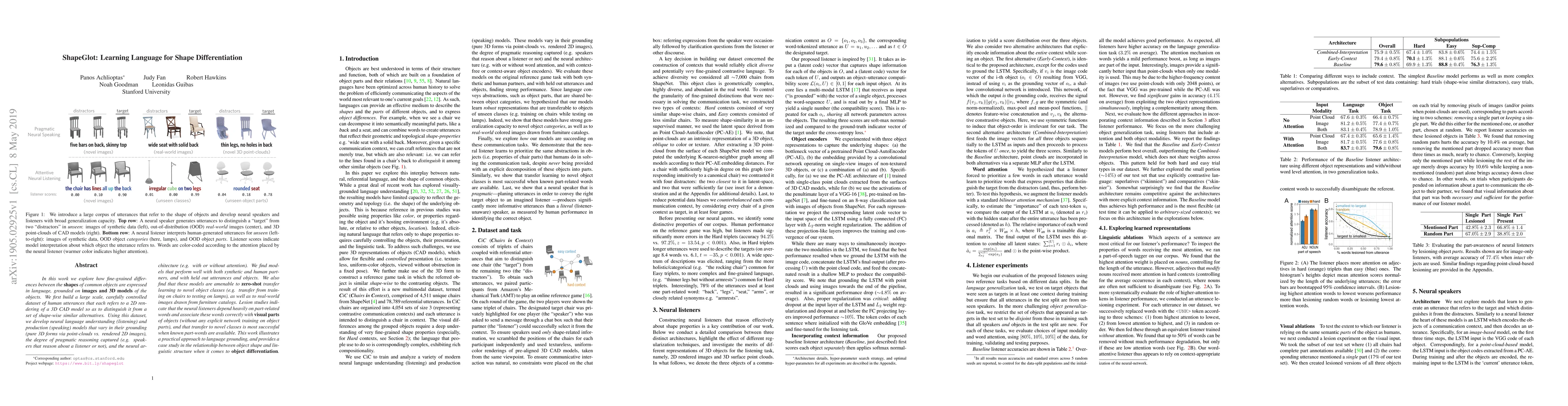 In this work we explore how fine-grained differences between the shapes of common objects are expressed in language, grounded on images and 3D models of the objects. We first build a large scale, carefully controlled dataset of human utterances that each refers to a 2D rendering of a 3D CAD model so as to distinguish it from a set of shape-wise similar alternatives. Using this dataset, we develop neural language understanding (listening) and production (speaking) models that vary in their grounding (pure 3D forms via point-clouds vs. rendered 2D images), the degree of pragmatic reasoning captured (e.g. speakers that reason about a listener or not), and the neural architecture (e.g. with or without attention). We find models that perform well with both synthetic and human partners, and with held out utterances and objects. We also find that these models are amenable to zero-shot transfer learning to novel object classes (e.g. transfer from training on chairs to testing on lamps), as well as to real-world images drawn from furniture catalogs. Lesion studies indicate that the neural listeners depend heavily on part-related words and associate these words correctly with visual parts of objects (without any explicit network training on object parts), and that transfer to novel classes is most successful when known part-words are available. This work illustrates a practical approach to language grounding, and provides a case study in the relationship between object shape and linguistic structure when it comes to object differentiation.
