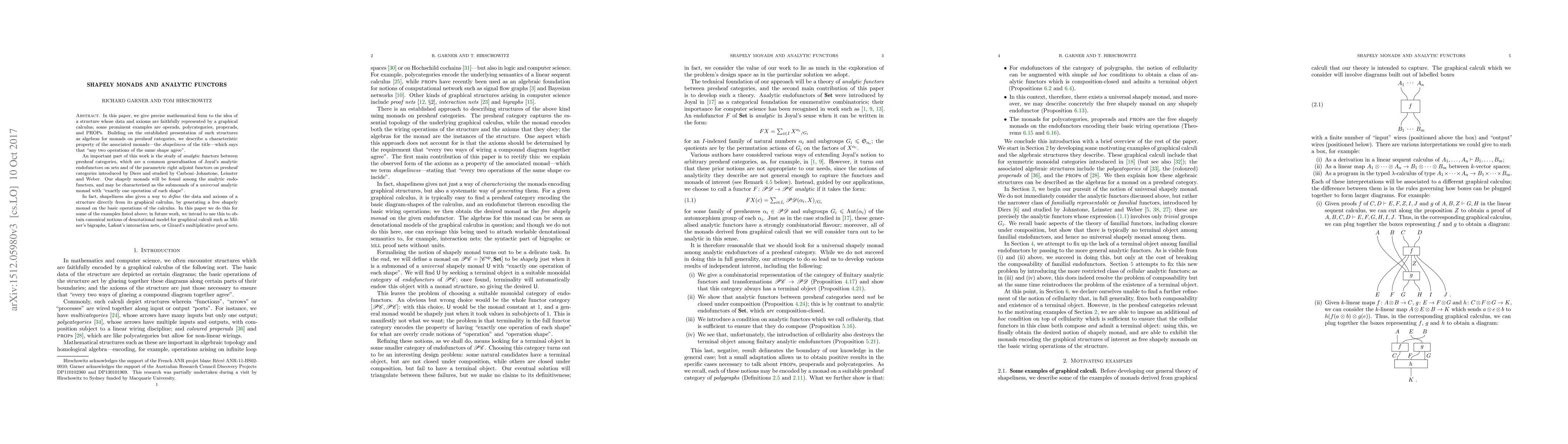 This paper formalizes the concept of shapely monads, which encapsulate structures like operads and PROPs through a graphical calculus, ensuring any operations of the same shape agree. It also explores analytic functors as a generalization of Joyal's and Diers's functors, characterizing shapely monads as submonads of a universal analytic monad.