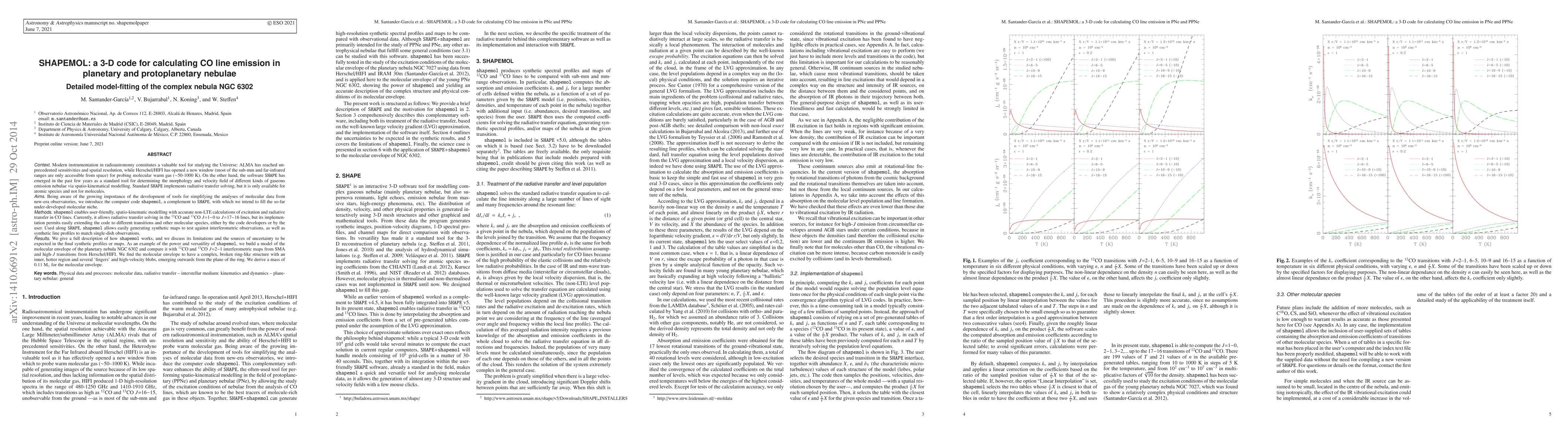 Modern instrumentation in radioastronomy constitutes a valuable tool for studying the Universe: ALMA has reached unprecedented sensitivities and spatial resolution, while Herschel/HIFI has opened a new window for probing molecular warm gas (~50-1000 K). On the other hand, the software SHAPE has emerged in the past few years as a standard tool for determining the morphology and velocity field of different kinds of gaseous emission nebulae via spatio-kinematical modelling. SHAPE implements radiative transfer solving, but it is only available for atomic species and not for molecules. Being aware of the growing importance of the development of tools for simplifying the analyses of molecular data, we introduce shapemol, a complement to SHAPE, with which we intend to fill the so-far under-developed molecular niche. shapemol enables user-friendly, spatio-kinematic modelling with accurate non-LTE calculations of excitation and radiative transfer in CO lines. It allows radiative transfer solving in the 12CO and 13CO J=1-0 to J=17-16 lines, but its implementation permits easily extending the code to different molecular species. shapemol allows easily generating synthetic maps and line profiles to match against interferometric or single-dish observations. We fully describe shapemol and discuss its limitations and the sources of uncertainty to be expected in the final synthetic profiles or maps. As an example of the power and versatility of shapemol, we build a model of the molecular envelope of the planetary nebula NGC 6302 and compare it with 12CO and 13CO J=2-1 interferometric maps from SMA and high-J transitions from Herschel/HIFI. We find the molecular envelope to have a complex, broken ring-like structure with an inner, hotter region and several 'fingers' and high-velocity blobs, emerging outwards from the plane of the ring. We derive a mass of 0.11 Msun for the molecular envelope.