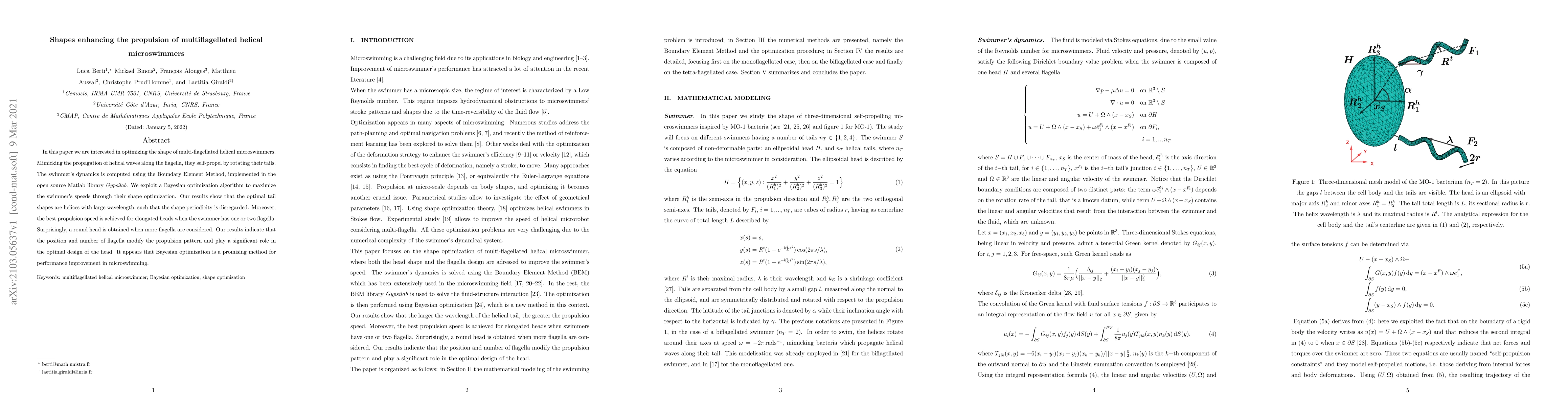 In this paper we are interested in optimizing the shape of multi-flagellated helical microswimmers. Mimicking the propagation of helical waves along the flagella, they self-propel by rotating their tails. The swimmer's dynamics is computed using the Boundary Element Method, implemented in the open source Matlab library $Gypsilab$. We exploit a Bayesian optimization algorithm to maximize the swimmer's speeds through their shape optimization. Our results show that the optimal tail shapes are helices with large wavelength, such that the shape periodicity is disregarded. Moreover, the best propulsion speed is achieved for elongated heads when the swimmer has one or two flagella. Surprisingly, a round head is obtained when more flagella are considered. Our results indicate that the position and number of flagella modify the propulsion pattern and play a significant role in the optimal design of the head. It appears that Bayesian optimization is a promising method for performance improvement in microswimming.