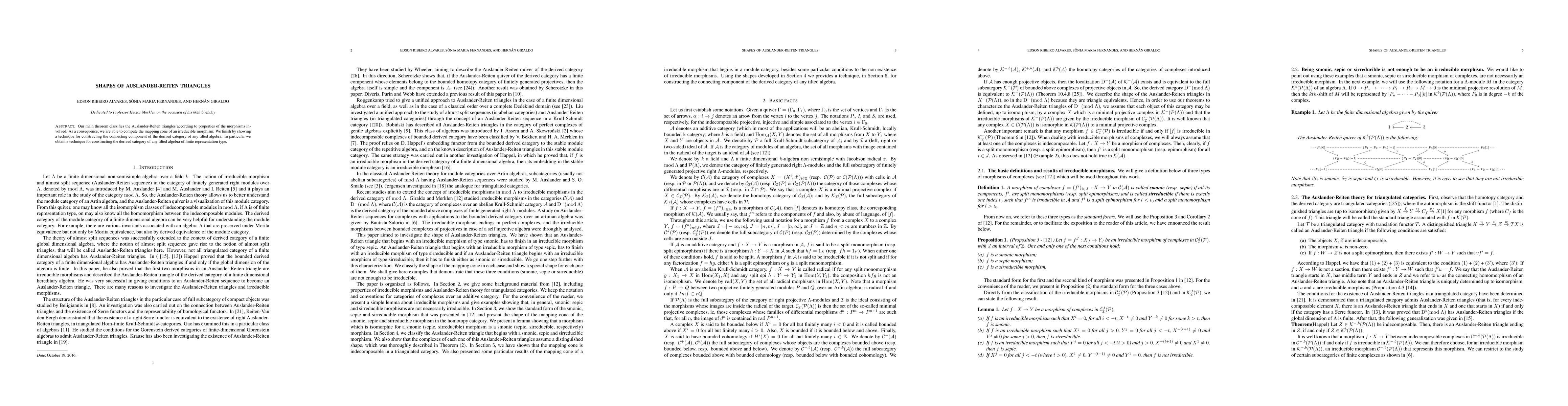 This research paper classifies Auslander-Reiten triangles according to morphism properties, enabling the computation of mapping cones and constructing the derived category of tilted algebras with finite representation type.