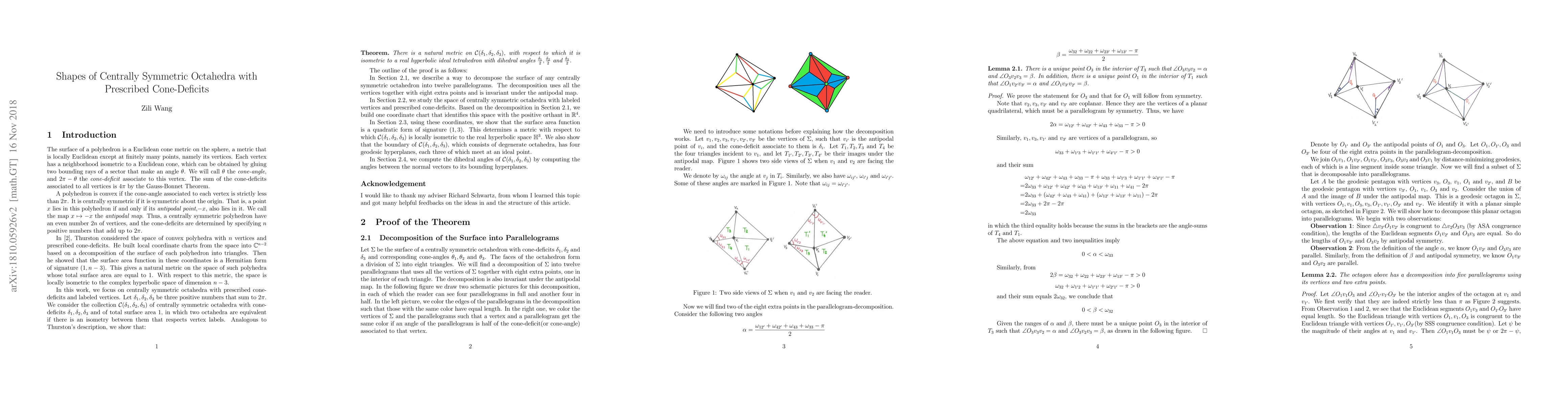 This paper investigates the shapes of centrally symmetric octahedra with specified cone-deficits, revealing that they form a real hyperbolic ideal tetrahedron with dihedral angles equal to half of the prescribed cone-deficits. This extends Thurston's findings on polyhedra to octahedra.