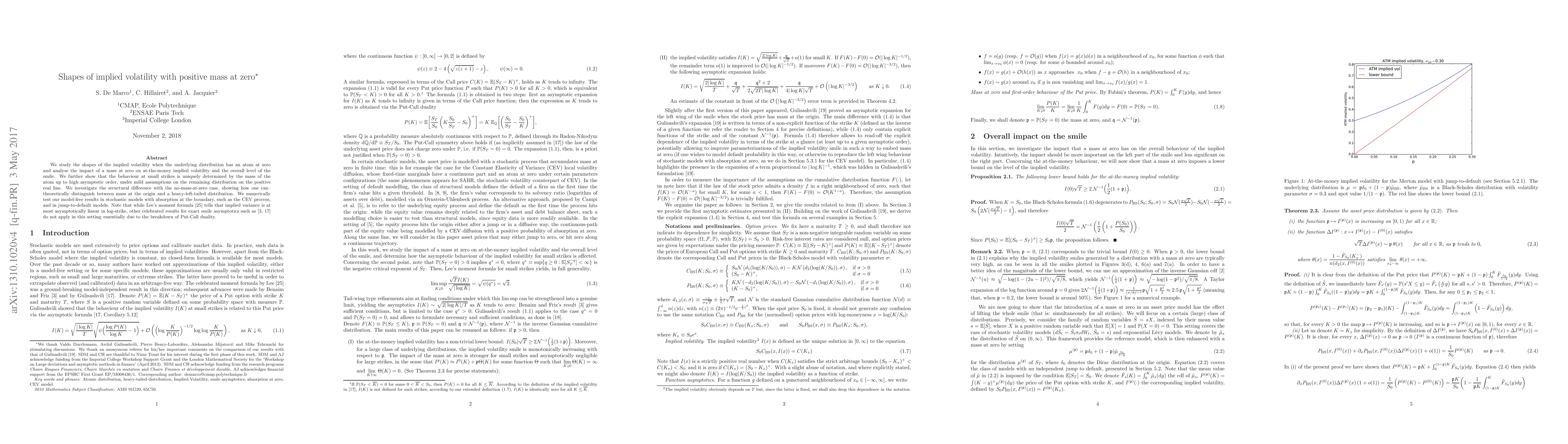 This paper examines the impact of mass at zero in underlying distribution on implied volatility shapes, finding that at-the-money implied volatility and smile level are affected. The study reveals the behavior at small strikes is determined by the mass of the atom, distinguishing between mass at origin and heavy-left-tailed distributions. Model-free results are tested in stochastic models with absorption at the boundary and jump-to-default models, highlighting that traditional smile asymptotics like Benaim and Friz (09), or Gulisashvili (10) do not apply due to Put-Call duality breakdown.