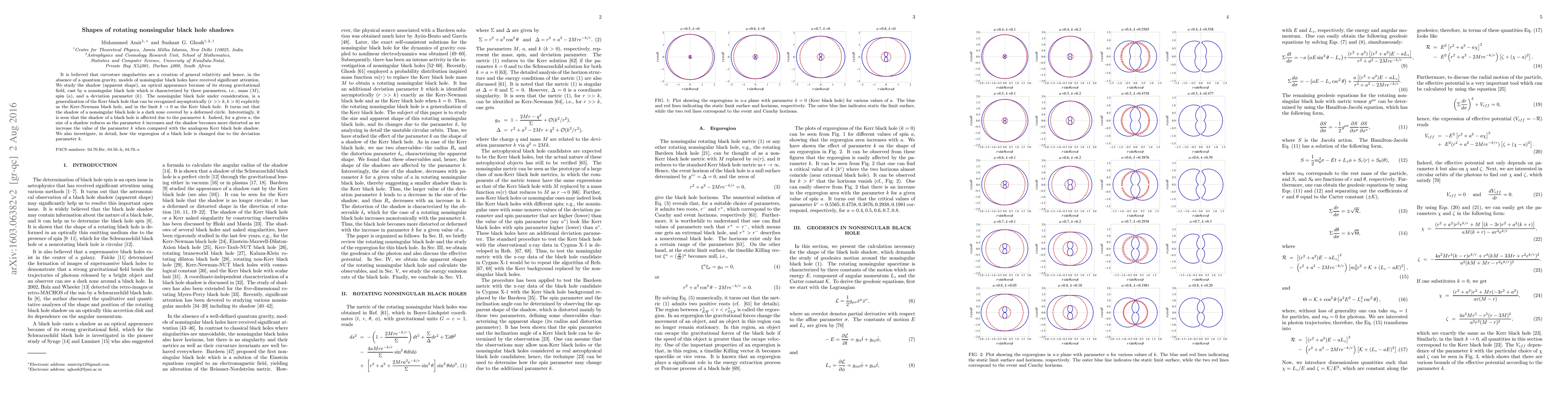 It is believed that curvature singularities are a creation of general relativity and hence, in the absence of a quantum gravity, models of nonsingular black holes have received significant attention. We study the shadow (apparent shape), an optical appearance because of its strong gravitational field, cast by a nonsingular black hole which is characterized by three parameters, i.e., mass ($M$), spin ($a$), and a deviation parameter ($k$). The nonsingular black hole under consideration, is a generalization of the Kerr black hole {that} can be recognized asymptotically ($r>>k, k>0$) explicitly as the Kerr-Newman black hole, and in the limit $k \rightarrow 0$ as the Kerr black hole. It turns out that the shadow of a nonsingular black hole is a dark zone covered by {a} deformed circle. Interestingly, it is seen that the shadow of a black hole is affected due to the parameter $k$. Indeed, for a given $a$, the size of a shadow reduces as the parameter $k$ increases and the shadow becomes more distorted as we increase the value of the parameter $k$ when compared with the analogous Kerr black hole shadow. We also investigate, in detail, how the ergoregion of a black hole is changed due to the deviation parameter $k$.
