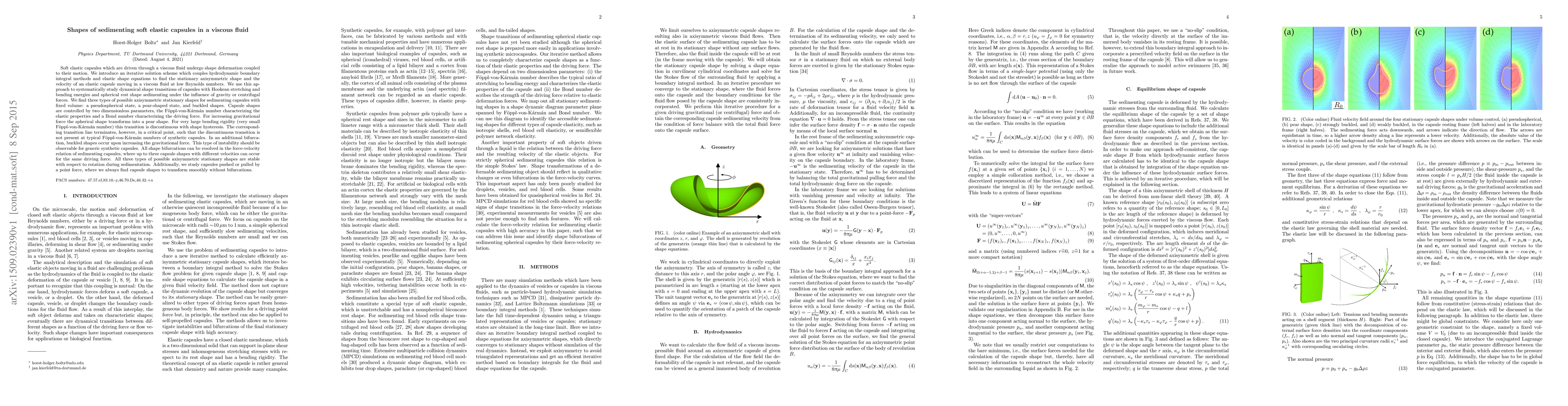 This paper investigates the shape deformation of soft elastic capsules moving through a viscous fluid under gravity or centrifugal forces, identifying three axisymmetric shapes: pseudospherical, pear-shaped, and buckled. The study reveals shape transitions controlled by elastic and driving force parameters, with bifurcations leading to observable instabilities in synthetic capsules.