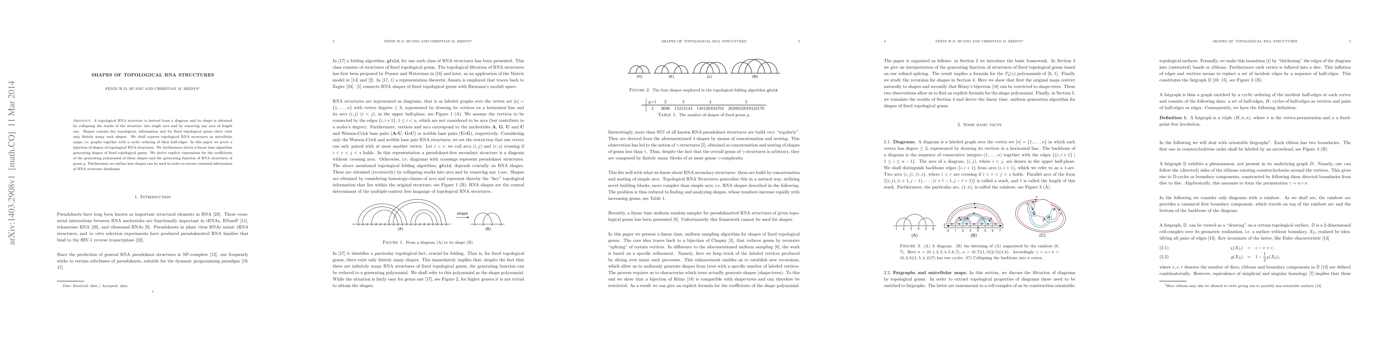 A topological RNA structure is derived from a diagram and its shape is obtained by collapsing the stacks of the structure into single arcs and by removing any arcs of length one. Shapes contain key topological, information and for fixed topological genus there exist only finitely many such shapes. We shall express topological RNA structures as unicellular maps, i.e. graphs together with a cyclic ordering of their half-edges. In this paper we prove a bijection of shapes of topological RNA structures. We furthermore derive a linear time algorithm generating shapes of fixed topological genus. We derive explicit expressions for the coefficients of the generating polynomial of these shapes and the generating function of RNA structures of genus $g$. Furthermore we outline how shapes can be used in order to extract essential information of RNA structure databases.