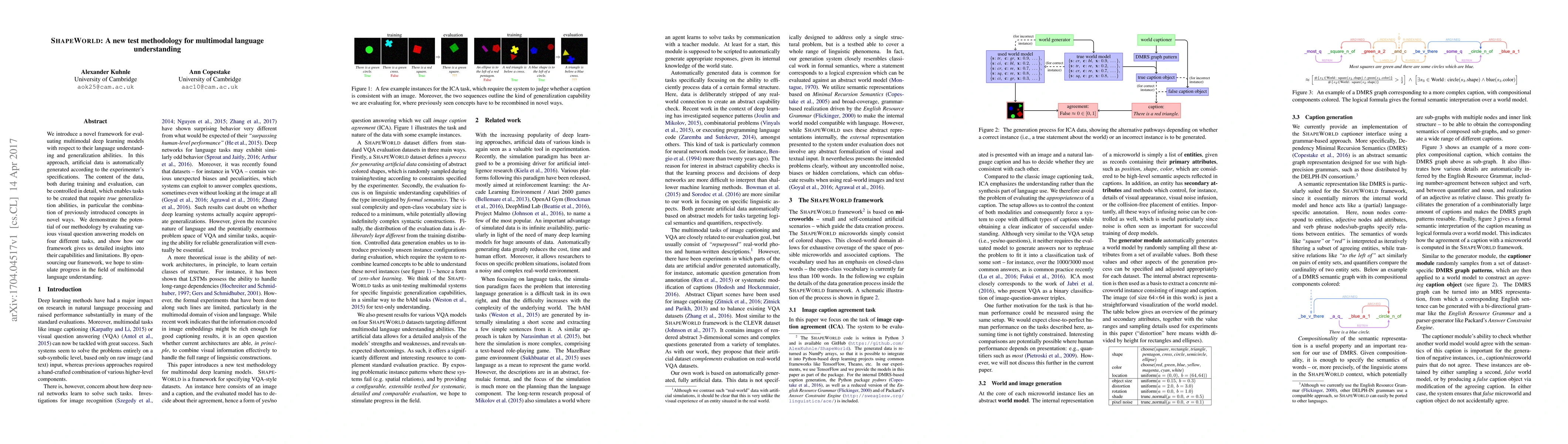 We introduce a novel framework for evaluating multimodal deep learning models with respect to their language understanding and generalization abilities. In this approach, artificial data is automatically generated according to the experimenter's specifications. The content of the data, both during training and evaluation, can be controlled in detail, which enables tasks to be created that require true generalization abilities, in particular the combination of previously introduced concepts in novel ways. We demonstrate the potential of our methodology by evaluating various visual question answering models on four different tasks, and show how our framework gives us detailed insights into their capabilities and limitations. By open-sourcing our framework, we hope to stimulate progress in the field of multimodal language understanding.
