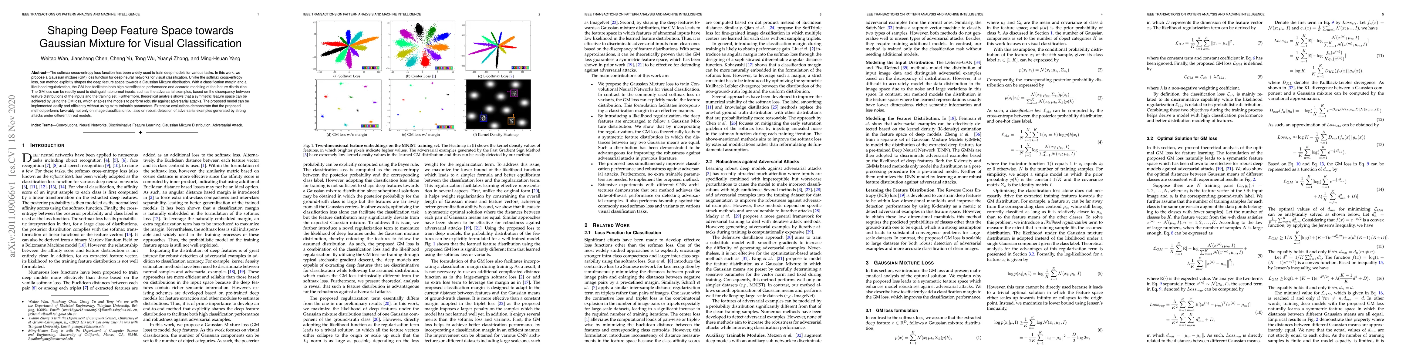 This research introduces a Gaussian Mixture (GM) loss function for deep neural networks in visual classification, unlike the common softmax cross-entropy. The GM loss shapes the feature space to a Gaussian Mixture, enhancing classification accuracy and distribution modeling. It helps distinguish abnormal inputs, like adversarial examples, by detecting discrepancies in feature distributions. The method ensures a symmetric feature space, making models robust to adversarial attacks without additional parameters, with successful evaluations in image classification and adversarial example detection.