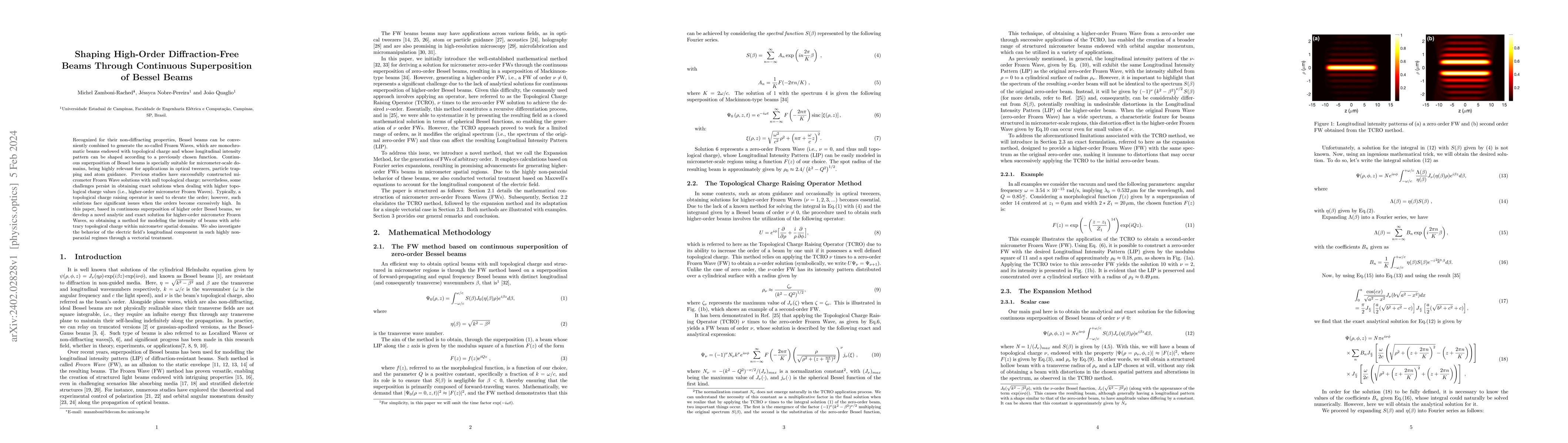 This paper presents a novel analytic method for generating higher-order diffraction-free Frozen Waves through continuous superposition of Bessel beams, addressing challenges in modeling beams with high topological charges in micrometer-scale domains. The approach also explores the electric field's longitudinal component in non-paraxial regimes.
