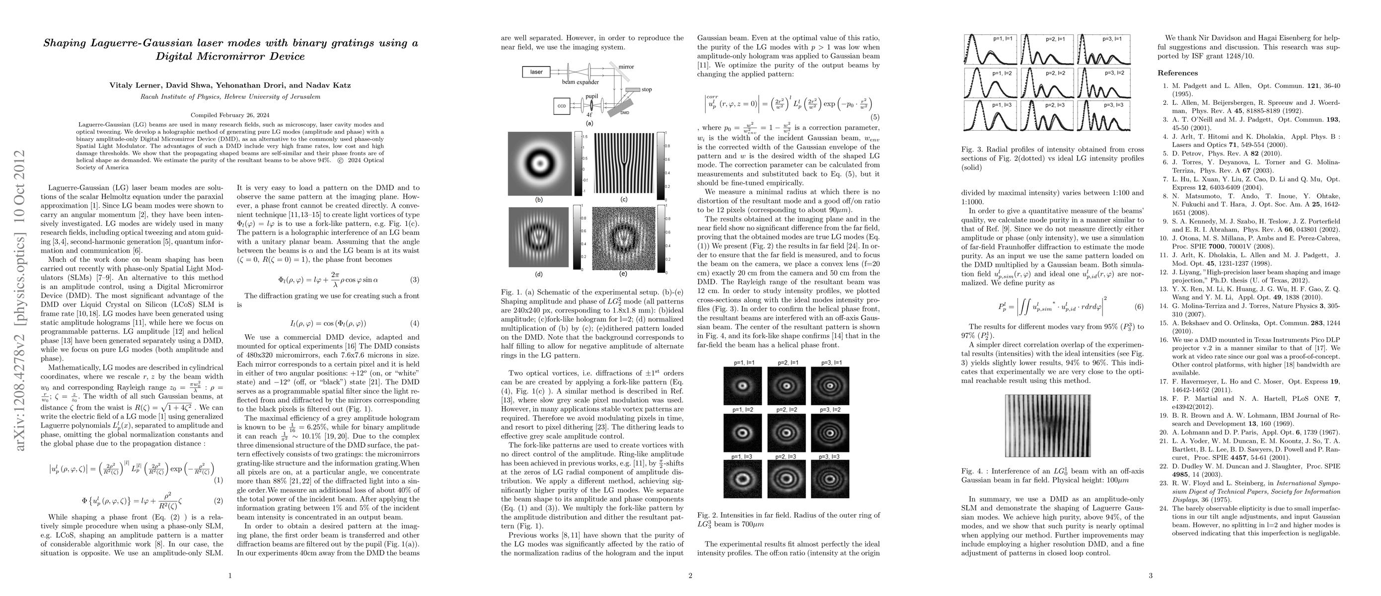 This paper presents a method for generating pure Laguerre-Gaussian laser modes using a high-speed, low-cost Digital Micromirror Device (DMD) instead of phase-only modulators. The shaped beams exhibit self-similarity and helical phase fronts, with beam purity estimated at over 94%.