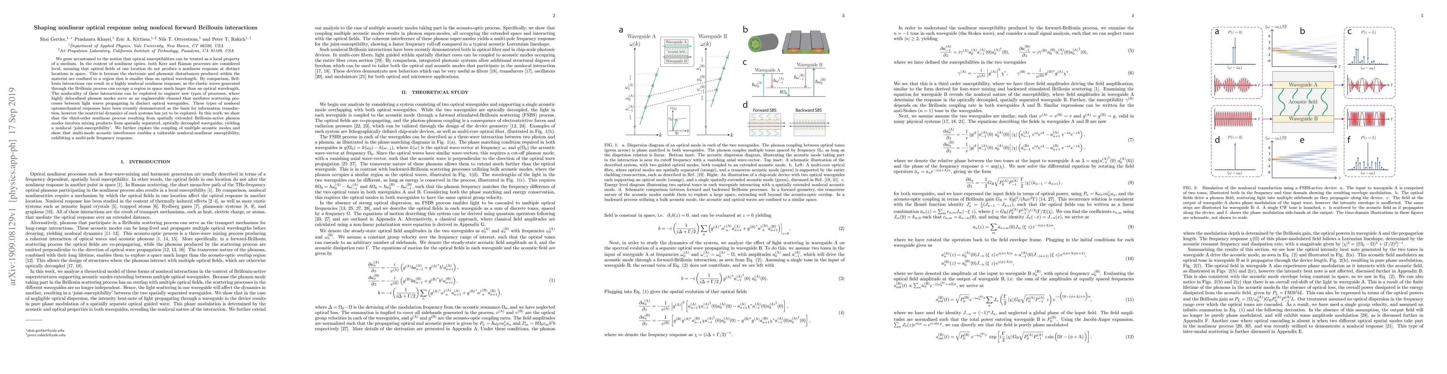 This paper explores the exploitation of nonlocal forward Brillouin interactions to engineer nonlinear optical responses, demonstrating a third-order nonlinear process mediated by spatially extended phonon modes. It reveals a tailorable nonlocal-nonlinear susceptibility through multi-mode acoustic interference, showcasing a multi-pole frequency response.