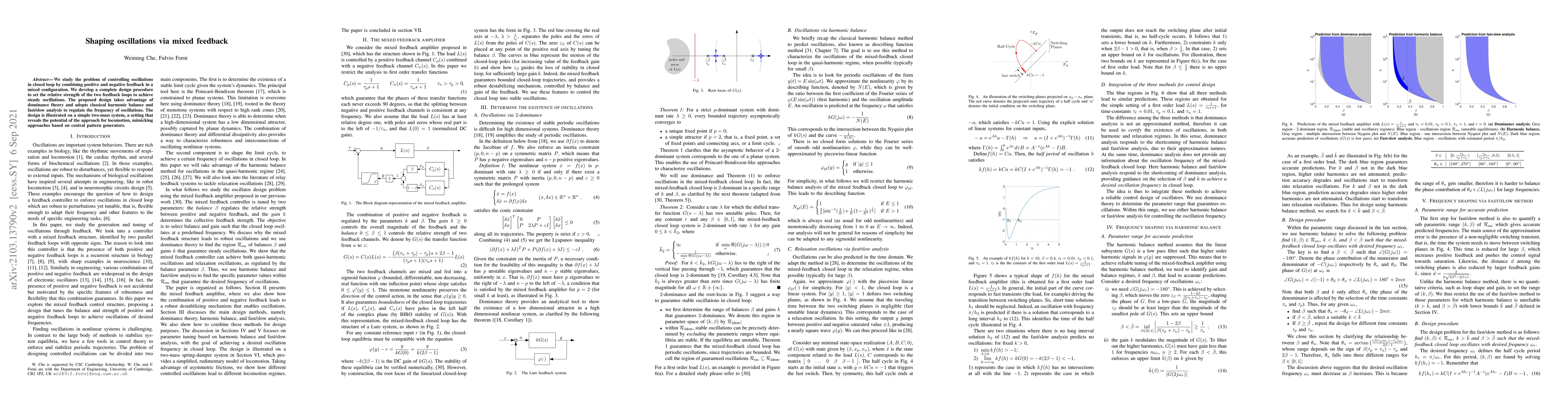 This paper proposes a design procedure for controlling oscillations using mixed feedback, combining positive and negative loops to achieve steady oscillations. The method leverages dominance theory, harmonic balance, and fast/slow analysis, demonstrated through a two-mass system for potential applications in locomotion.