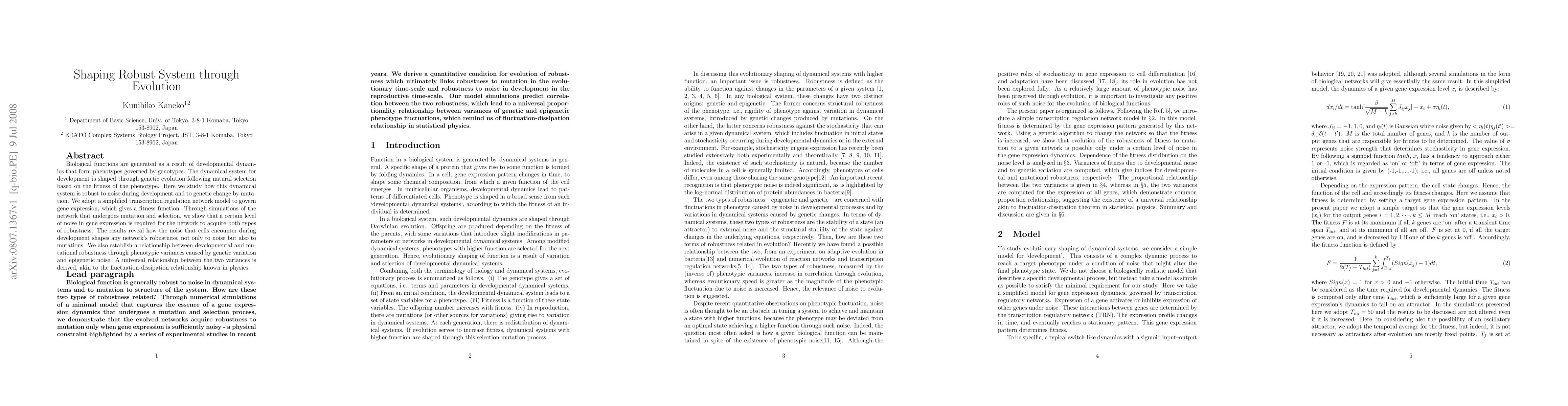 Biological functions are generated as a result of developmental dynamics that form phenotypes governed by genotypes. The dynamical system for development is shaped through genetic evolution following natural selection based on the fitness of the phenotype. Here we study how this dynamical system is robust to noise during development and to genetic change by mutation. We adopt a simplified transcription regulation network model to govern gene expression, which gives a fitness function. Through simulations of the network that undergoes mutation and selection, we show that a certain level of noise in gene expression is required for the network to acquire both types of robustness. The results reveal how the noise that cells encounter during development shapes any network's robustness, not only to noise but also to mutations. We also establish a relationship between developmental and mutational robustness through phenotypic variances caused by genetic variation and epigenetic noise. A universal relationship between the two variances is derived, akin to the fluctuation-dissipation relationship known in physics.