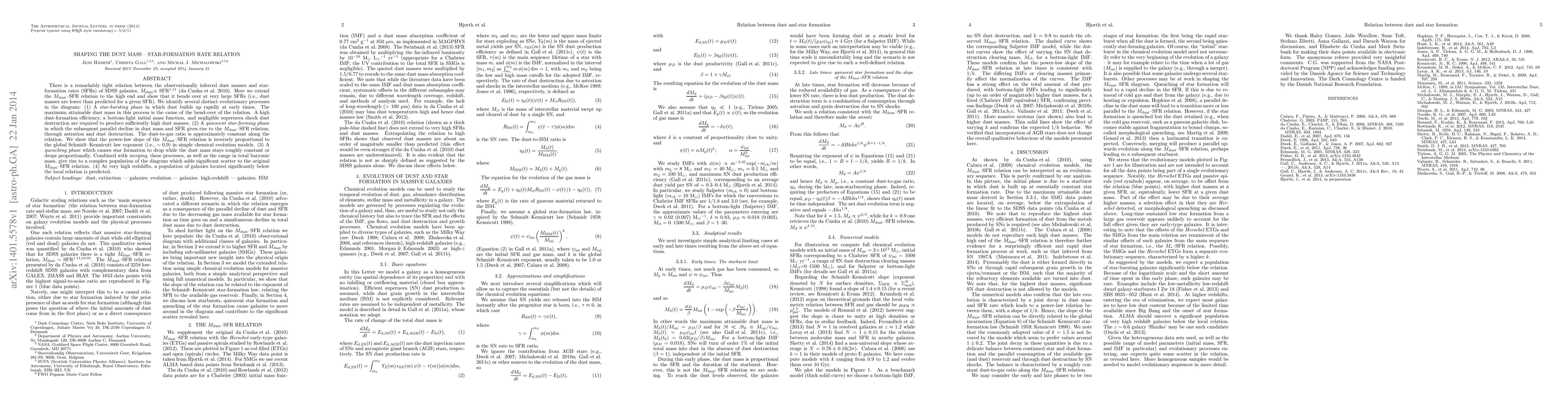 There is a remarkably tight relation between the observationally inferred dust masses and star-formation rates (SFRs) of SDSS galaxies, Mdust $\propto$ SFR$^{1.11}$ (Da Cunha et al. 2010). Here we extend the Mdust-SFR relation to the high end and show that it bends over at very large SFRs (i.e., dust masses are lower than predicted for a given SFR). We identify several distinct evolutionary processes in the diagram: (1) A star-bursting phase in which dust builds up rapidly at early times. The maximum attainable dust mass in this process is the cause of the bend-over of the relation. A high dust-formation efficiency, a bottom-light initial mass function, and negligible supernova shock dust destruction are required to produce sufficiently high dust masses. (2) A quiescent star-forming phase in which the subsequent parallel decline in dust mass and SFR gives rise to the Mdust-SFR relation, through astration and dust destruction. The dust-to-gas ratio is approximately constant along the relation. We show that the power-law slope of the Mdust-SFR relation is inversely proportional to the global Schmidt-Kennicutt law exponent (i.e., $\sim 0.9$) in simple chemical evolution models. (3) A quenching phase which causes star formation to drop while the dust mass stays roughly constant or drops proportionally. Combined with merging, these processes, as well as the range in total baryonic mass, give rise to a complex population of the diagram which adds significant scatter to the original Mdust-SFR relation. (4) At very high redshifts, a population of galaxies located significantly below the local relation is predicted.