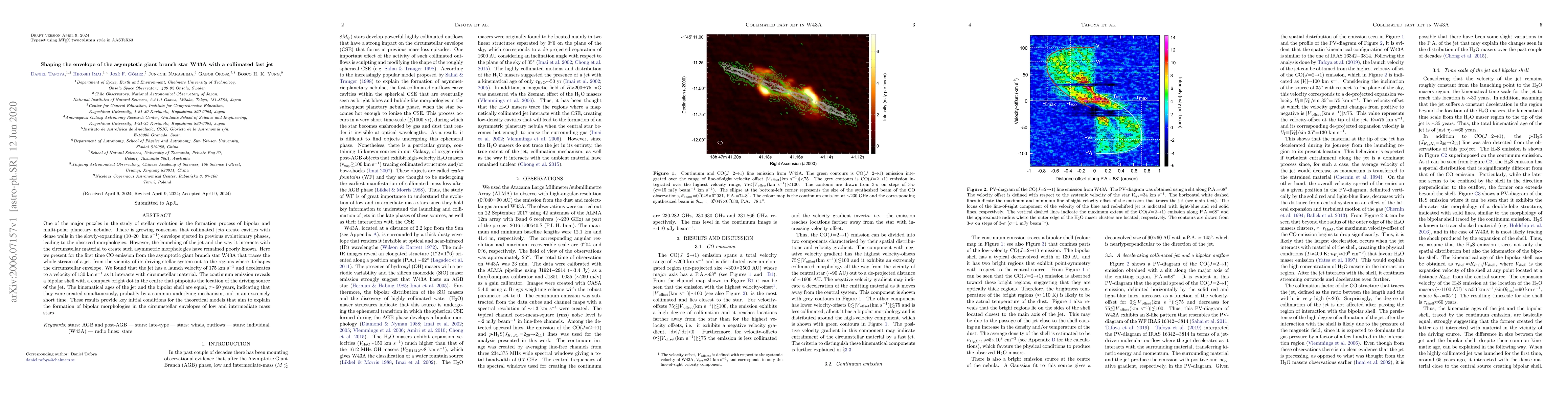 One of the major puzzles in the study of stellar evolution is the formation process of bipolar and multi-polar planetary nebulae. There is growing consensus that collimated jets create cavities with dense walls in the slowly-expanding (10--20 ~km~s$^{-1}$) envelope ejected in previous evolutionary phases, leading to the observed morphologies. However, the launching of the jet and the way it interacts with the circumstellar material to create such asymmetric morphologies have remained poorly known. Here we present for the first time CO emission from the asymptotic giant branch star W43A that traces the whole stream of a jet, from the vicinity of its driving stellar system out to the regions where it shapes the circumstellar envelope. We found that the jet has a launch velocity of 175~km~s$^{-1}$ and decelerates to a velocity of 130~km~s$^{-1}$ as it interacts with circumstellar material. The continuum emission reveals a bipolar shell with a compact bright dot in the centre that pinpoints the location of the driving source of the jet. The kinematical ages of the jet and the bipolar shell are equal, $\tau$$\sim$60~years, indicating that they were created simultaneously, probably by a common underlying mechanism, and in an extremely short time. These results provide key initial conditions for the theoretical models that aim to explain the formation of bipolar morphologies in the circumstellar envelopes of low and intermediate mass stars.