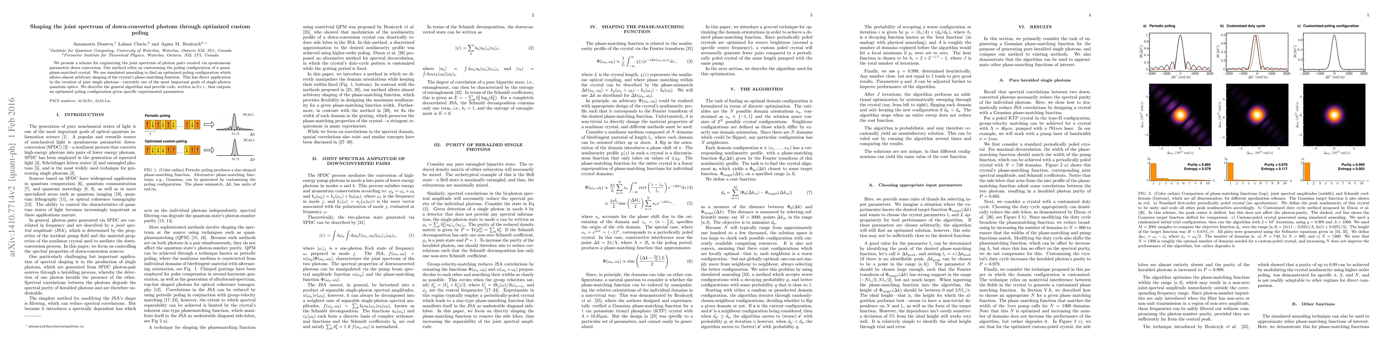 We present a scheme for engineering the joint spectrum of photon pairs created via spontaneous parametric down conversion. Our method relies on customizing the poling configuration of a quasi-phase-matched crystal. We use simulated annealing to find an optimized poling configuration which allows almost arbitrary shaping of the crystal's phase-matching function. This has direct application in the creation of pure single photons---currently one of the most important goals of single-photon quantum optics. We describe the general algorithm and provide code, written in C++, that outputs an optimized poling configuration given specific experimental parameters.