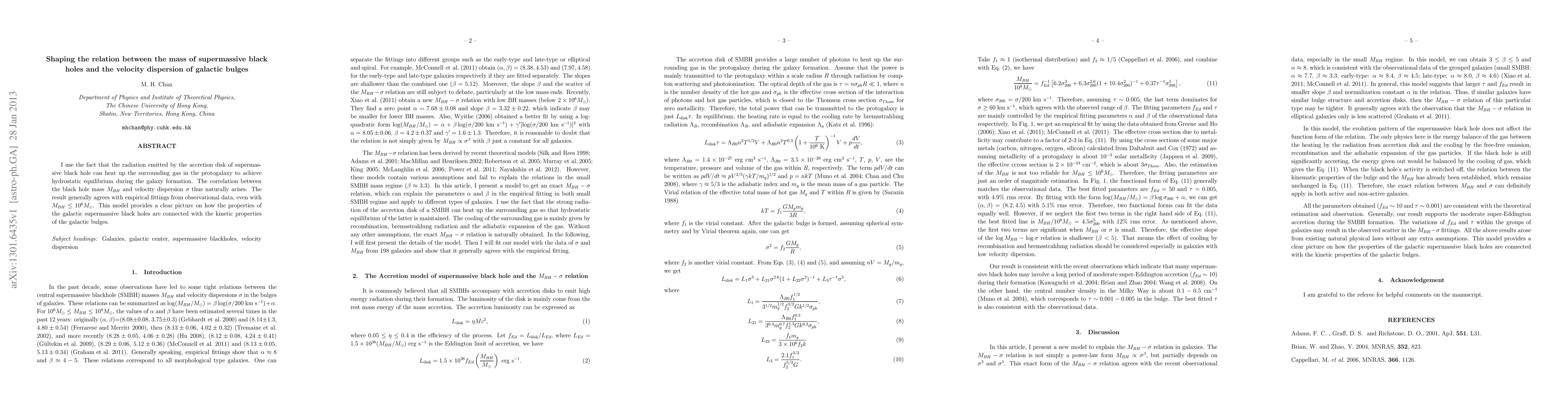 This paper explores the correlation between supermassive black hole mass (M_BH) and the velocity dispersion (\sigma) of galactic bulges, showing that radiation from the black hole's accretion disk can stabilize the surrounding gas, leading to a naturally arising relationship. The findings align with observational data, offering insight into the connection between black hole properties and galactic bulge dynamics.