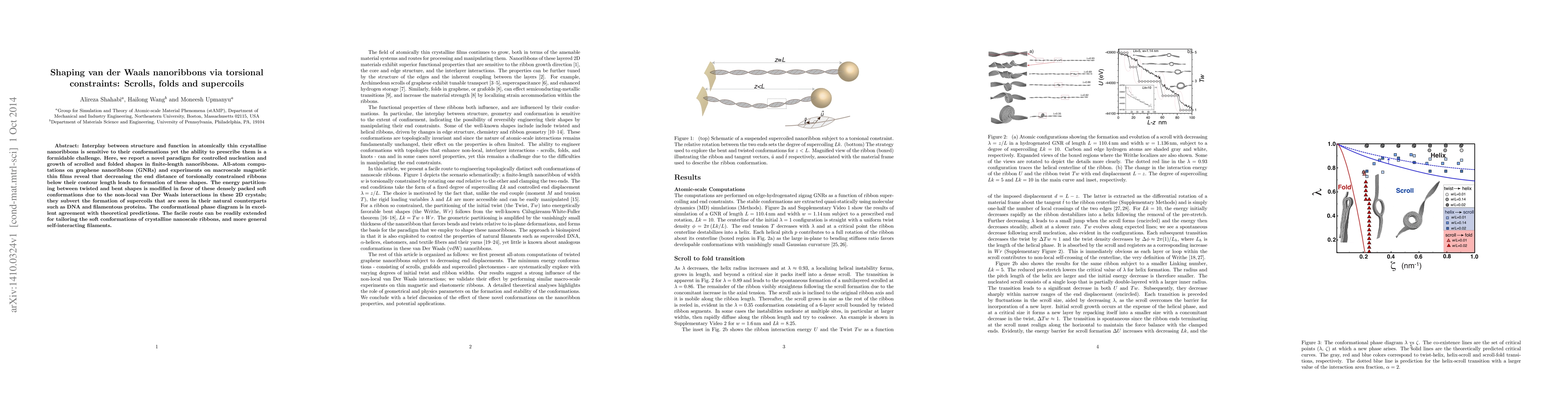 Interplay between structure and function in atomically thin crystalline nanoribbons is sensitive to their conformations yet the ability to prescribe them is a formidable challenge. Here, we report a novel paradigm for controlled nucleation and growth of scrolled and folded shapes in finite-length nanoribbons. All-atom computations on graphene nanoribbons (GNRs) and experiments on macroscale magnetic thin films reveal that decreasing the end distance of torsionally constrained ribbons below their contour length leads to formation of these shapes. The energy partitioning between twisted and bent shapes is modified in favor of these densely packed soft conformations due to the non-local van Der Waals interactions in these 2D crystals; they subvert the formation of supercoils that are seen in their natural counterparts such as DNA and filamentous proteins. The conformational phase diagram is in excellent agreement with theoretical predictions. The facile route can be readily extended for tailoring the soft conformations of crystalline nanoscale ribbons, and more general self-interacting filaments