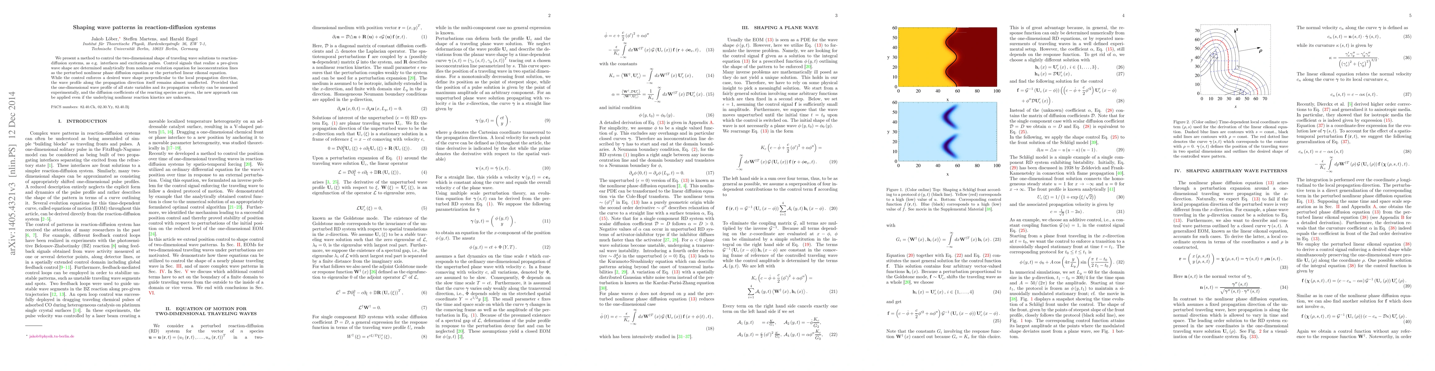 This paper introduces a method for controlling the two-dimensional shape of traveling wave solutions in reaction-diffusion systems, determining control signals analytically from nonlinear evolution equations. The method allows for desired wave shapes to be enforced while minimally affecting the wave profile along the propagation direction.